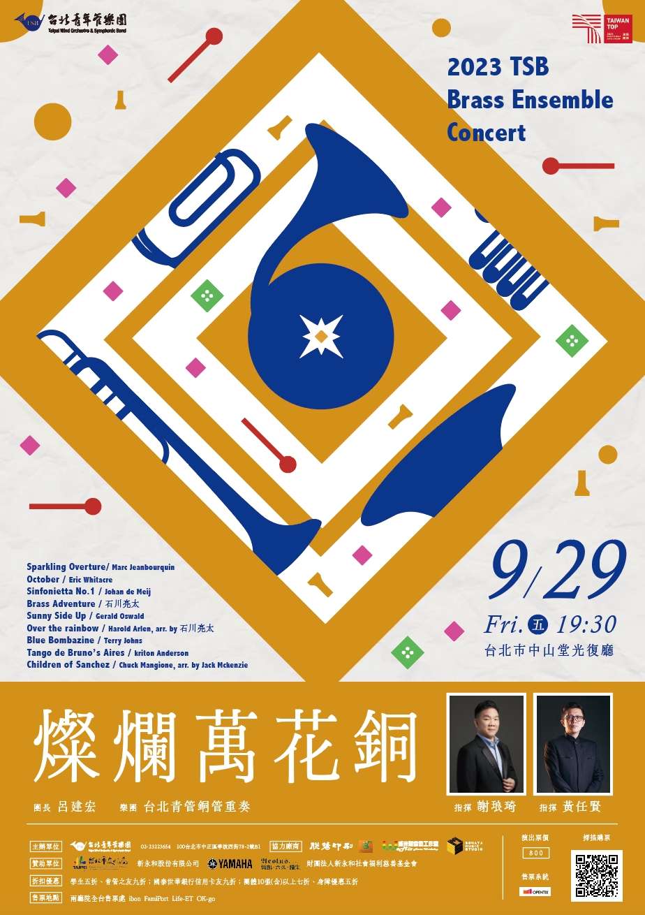 一、2023台北青管重奏音樂會,由謝琅琦、黃任賢老師指揮, 率領台北青管銅管與打擊團員,演出包羅萬象銅管重奏樂 曲,為難得一見的精緻演出。