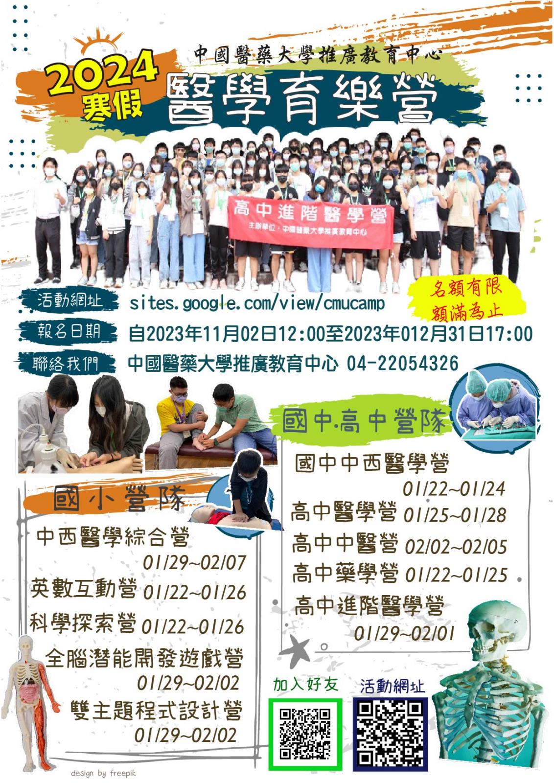 三、報名日期:即日起至2023年12月31日17:00止(國小營隊報名至活動前兩週),活動簡章及詳情,請詳閱活動網頁。