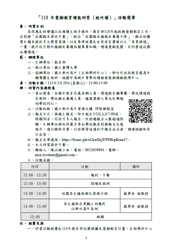 為應用「校園樹木植栽及養護手冊」提升學校植樹及養護 相關專業知識,介紹校園原生植物綠化資源及在景觀上的 應用,教育部特規劃旨揭研習。