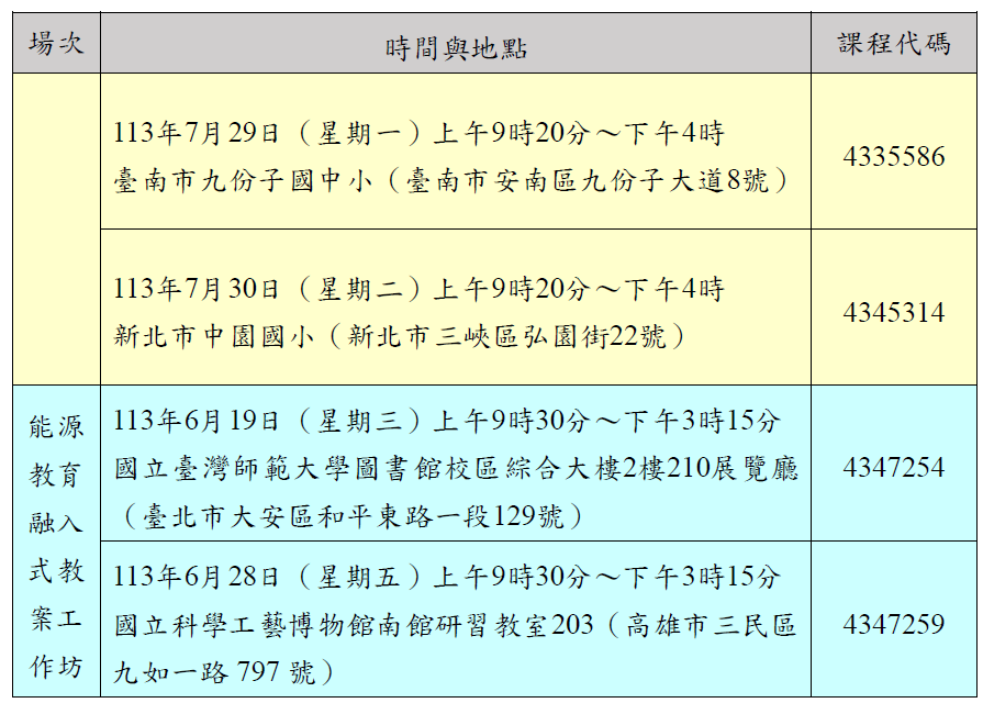 報名方式與場次資訊: 歡迎至全國教師在職進修網 (https://www6.inservice.edu.tw) , 輸入課程代碼線上報名。