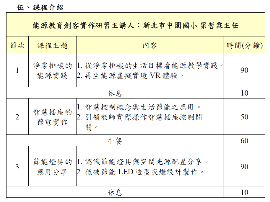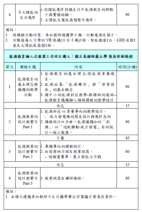 配合十二年國教「跨領域整合」及「生活實踐」等特性,以 「能源實務教學」為主軸辦理能源教育創客實作研習及能源教育融入式教案工作坊,透過活動辦理,培育教師基礎能源教育知能,傳遞正確能源教育知識、節約能源手法,輔導教師能源教育教學能力,並講授能源教育教案設計、教材編制及課程規劃,引領教師實際參與開發能源教育融入式教案,進而強化教學活動設計能力及能源教育教學技巧。