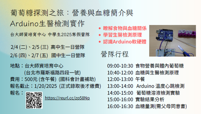 一、為促進國高中學生對於人體葡萄糖的運作以及葡萄糖生醫 檢測的原理的了解,設計此寒假營隊一日活動。