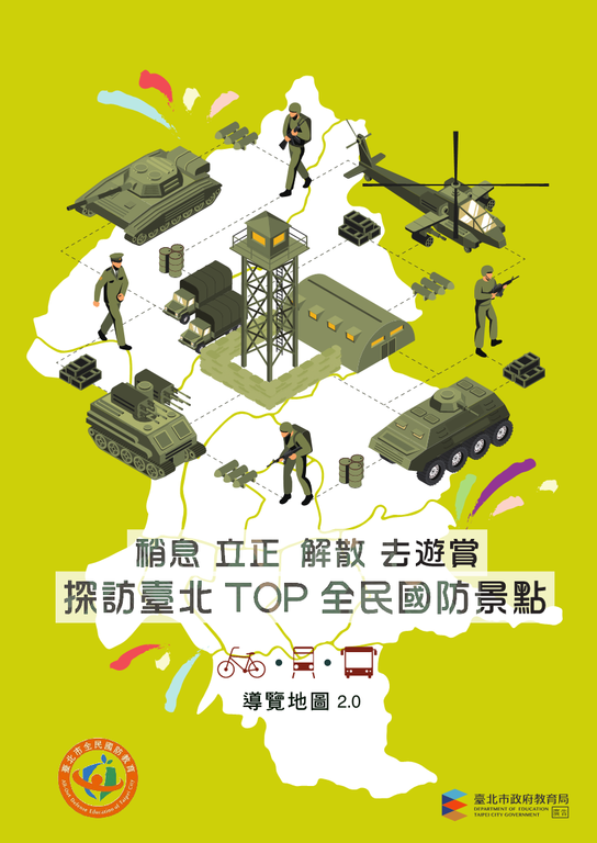 臺北市政府教育局為推廣全民國防教育,規劃設計「臺北˙全民國防景點導覽圖」宣導摺頁,本地圖除闡述景點歷史典故及相關資訊外,並結合Ubike微笑單車及捷運等交通資訊,讓民眾藉由觀光旅遊建立全民國防的觀念,歡迎民眾自行下載運用。
