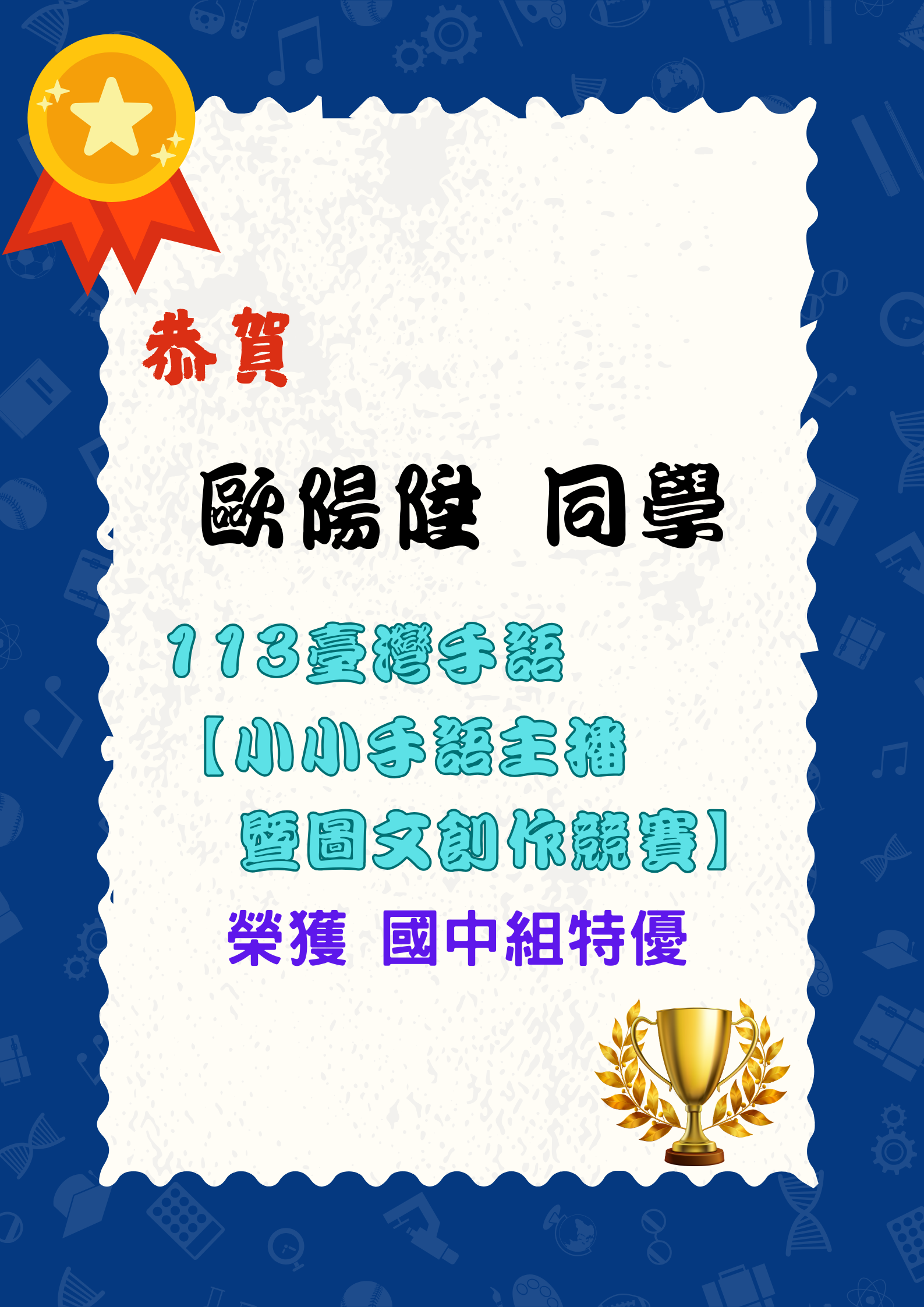 恭賀本校歐陽陞同學參加113學年度臺灣手語課程遠距直播共學計畫【小小手語主播暨圖文創作競賽】,榮獲國中組特優。