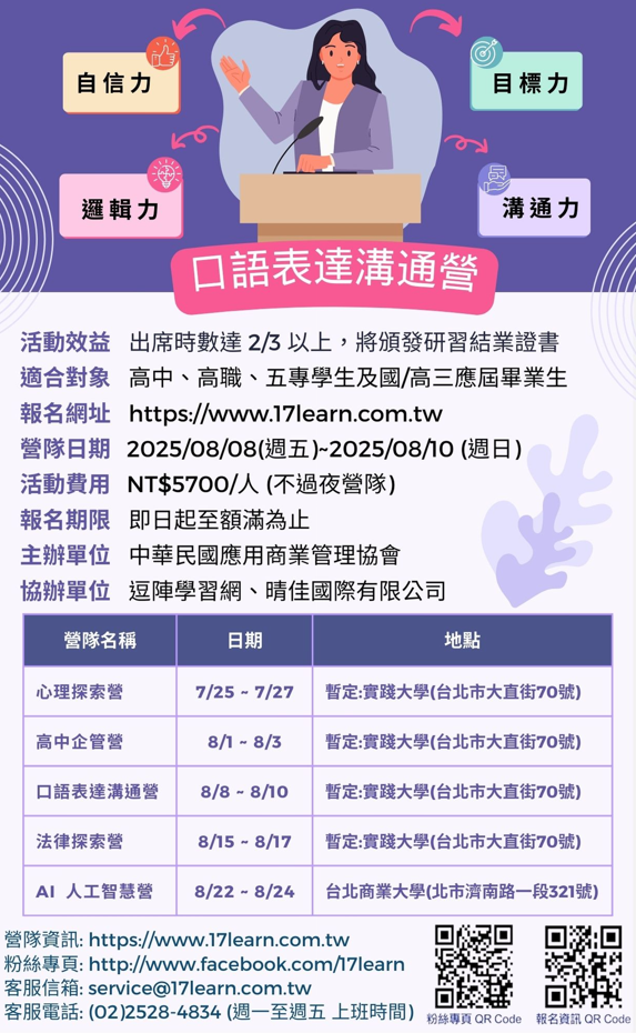說明:無論是升學口試或求職面談,口語表達已經是現代人不可 或缺的能力。「口語表達溝通營」透過講解、示範、訓練 和不斷的演練,克服公開發言的恐懼,人人都可以成為口 語表達的高手!