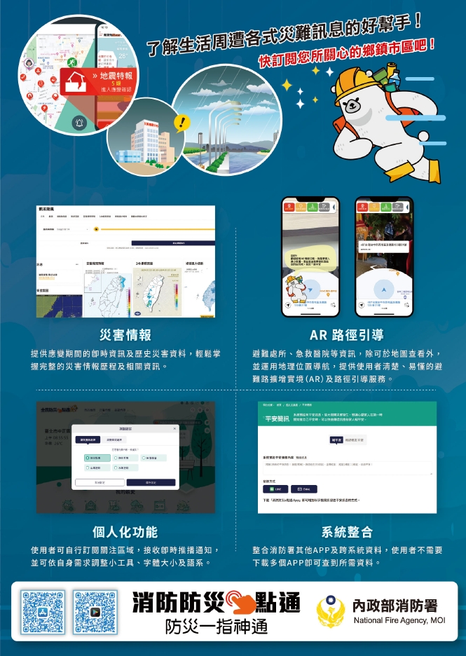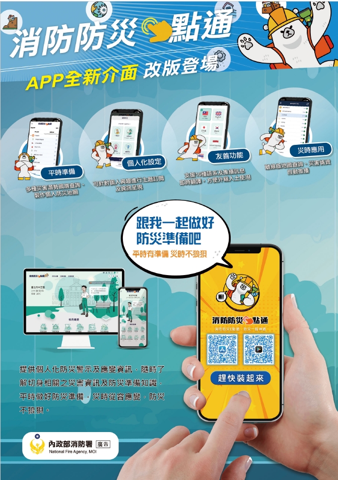 最新防災資 訊、緊急避難處所位置即時掌控,立即上網搜尋「消防 防災e點通」