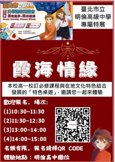 一、本校參與115年3月21日臺北市2026年高中職升學進路博覽會,為展現學校特色課程,除文宣資料及成果展示外,特於攤位設置「霞海情緣」特展,內容為本校高一校訂必修課程結合大稻埕在地文化所發展之特色桌遊,敬邀貴校學生參與體驗。