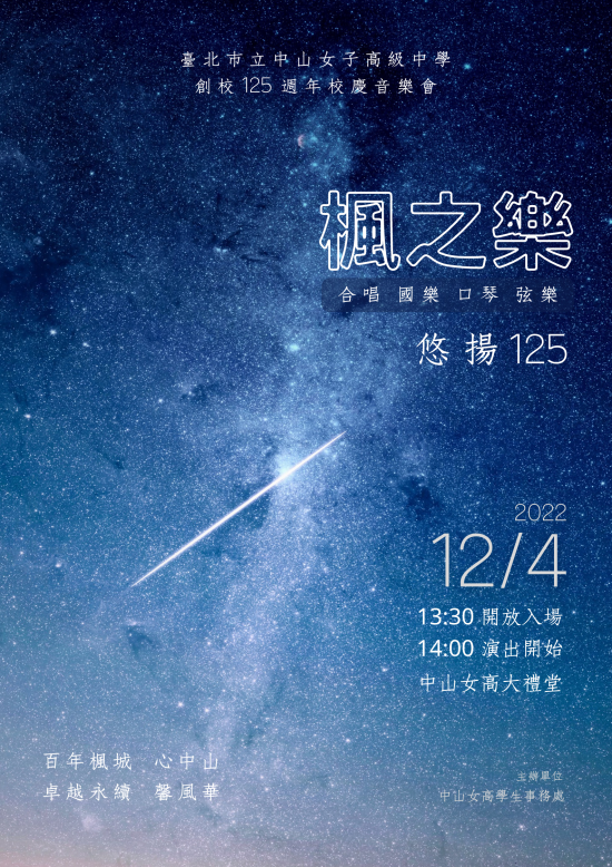 一、民國111年為臺北市立中山女子高級中學創校125年,為慶祝125週年校慶,該校特辦理旨揭活動。