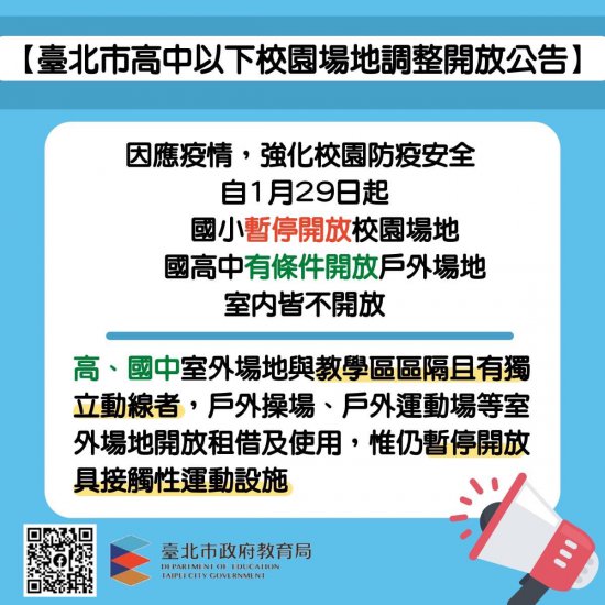 考量國內COVID-19疫情升溫,本校自111年1月29日起暫停開放室內籃球場及跆拳道教室。
