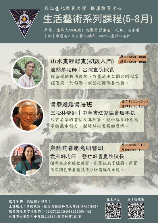 檢送國立臺北教育大學推廣教育中心生活藝術系列課程「書藝逸趣書法班、鳥語花香創意研習班、山水畫輕鬆畫(初級入門)」招生訊息。