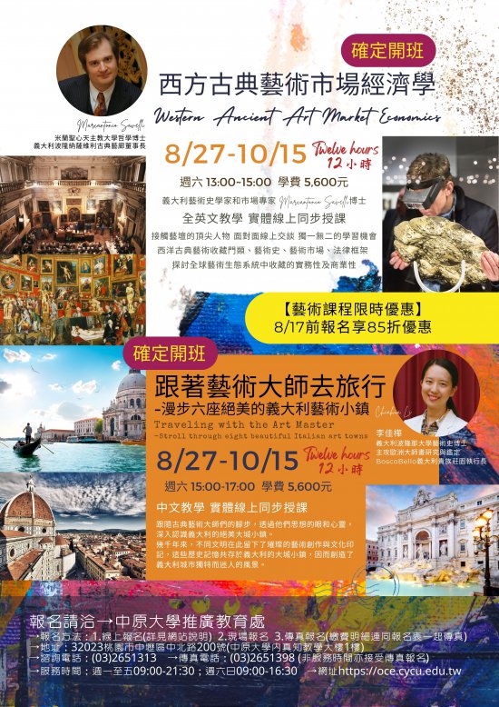 檢送中原大學辦理「西方古典藝術市場經濟學」及「跟著藝術 大師去旅行-漫步六座絕美的義大利藝術小鎮」實體、線上同步授課課程招生海報1份,鼓勵教師報名參加。