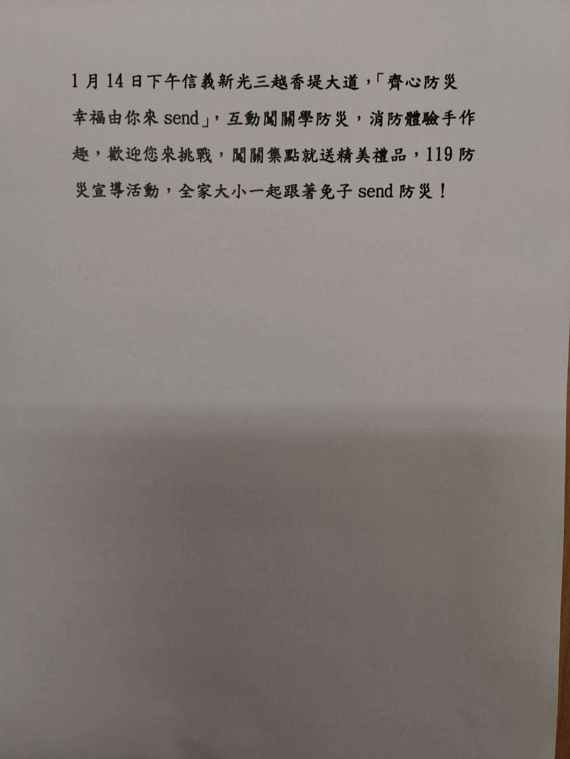 1月14日下午信義新光三越香堤大道,「齊心防災 幸福由你來send」,互動闖關學防災,消防體驗手作趣,歡迎您來挑戰