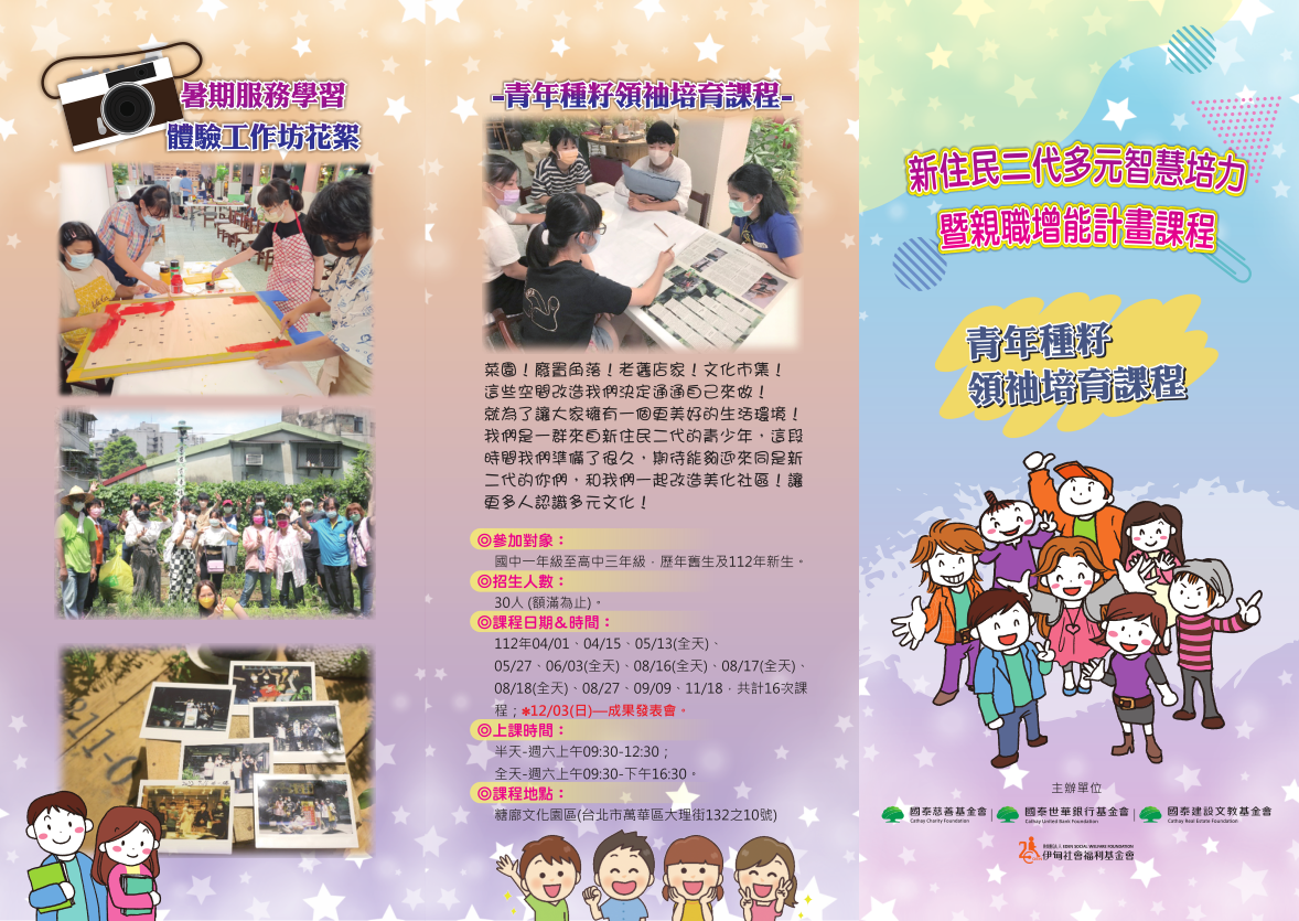 四、「新住民二代青年種籽領袖培育課程」之招生對象:國中一年級至高中三年級之新二代,課程辦理時間:112年04月01 日至11月18日,半天為週六上午9點30分至12點30分;全天 為周六上午9點30分至下午4點30分;上課地點:糖?文化園 區(臺北市萬華區大理街132之10號)辦理,每月課程日期詳 見招生宣傳單。