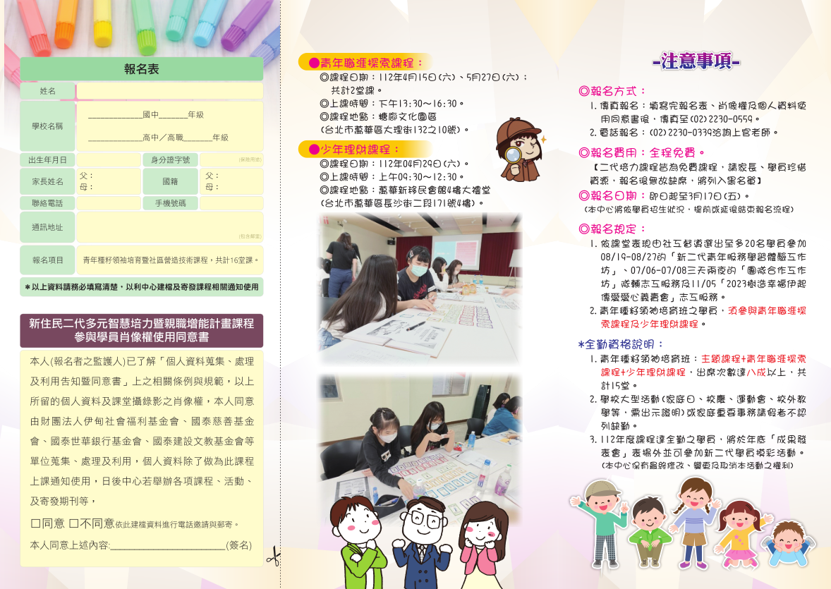 五、敬請貴校轉知各班級導師及家長,邀請新住(移)民二代學 員踴躍報名參加,並惠請將此課程訊息刊登在網站上。