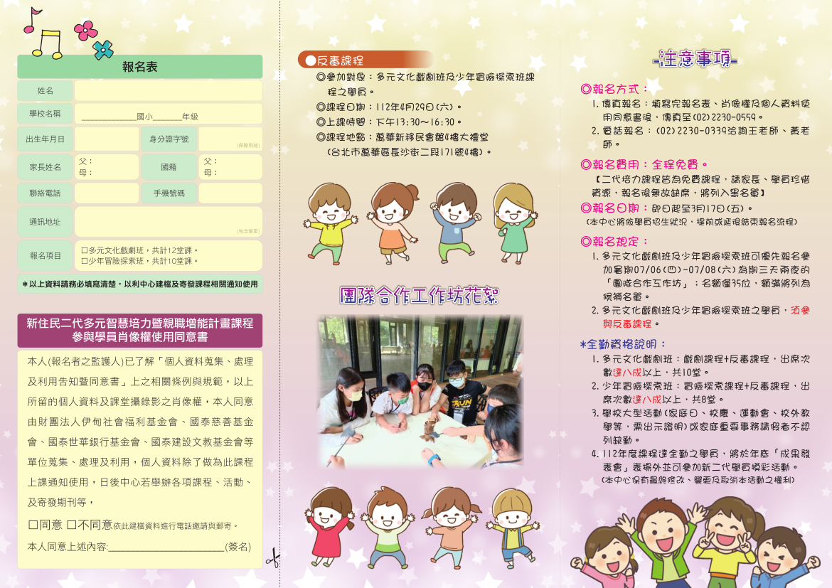 二、「新住民二代多元文化戲劇班」之招生對象:國小一至三年級之新二代,課程辦理時間:112年03月11日至12月02 日,半天為週六上午9點30分至12點30分;全天為週六上午9點30分至下午4點30分;上課地點:台北市萬華新移民會 館4樓辦理,每月課程日期詳見招生宣傳單。