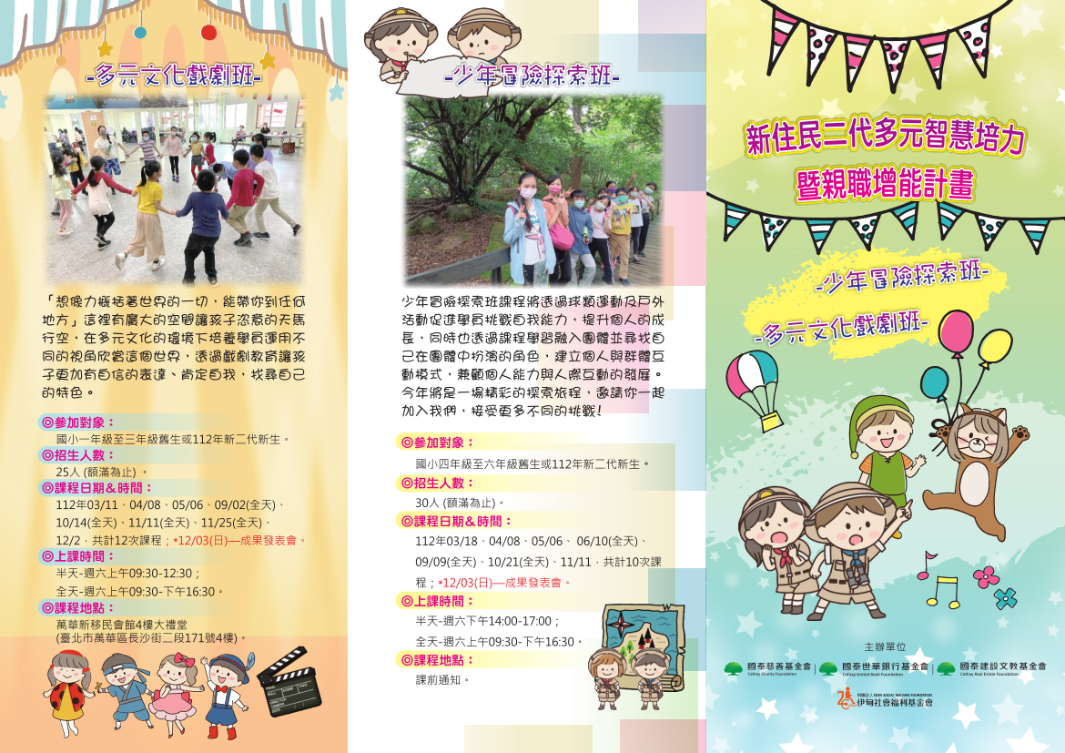 一、本會與國泰慈善基金會、國泰世華銀行基金會及國泰建設文教基金會長期致力於新住民弱勢家庭關懷服務,並持續辦理「新住民二代多元智慧培力暨親職增能計畫」,本計 畫以新住民二代培力為目標,因應不同年齡階段設計各班課程內容,旨在培養多元優勢能力,引導其自我探索,增 進溝通表達之能力,並協助新二代建立更具自我經驗價值的能力與特色。
