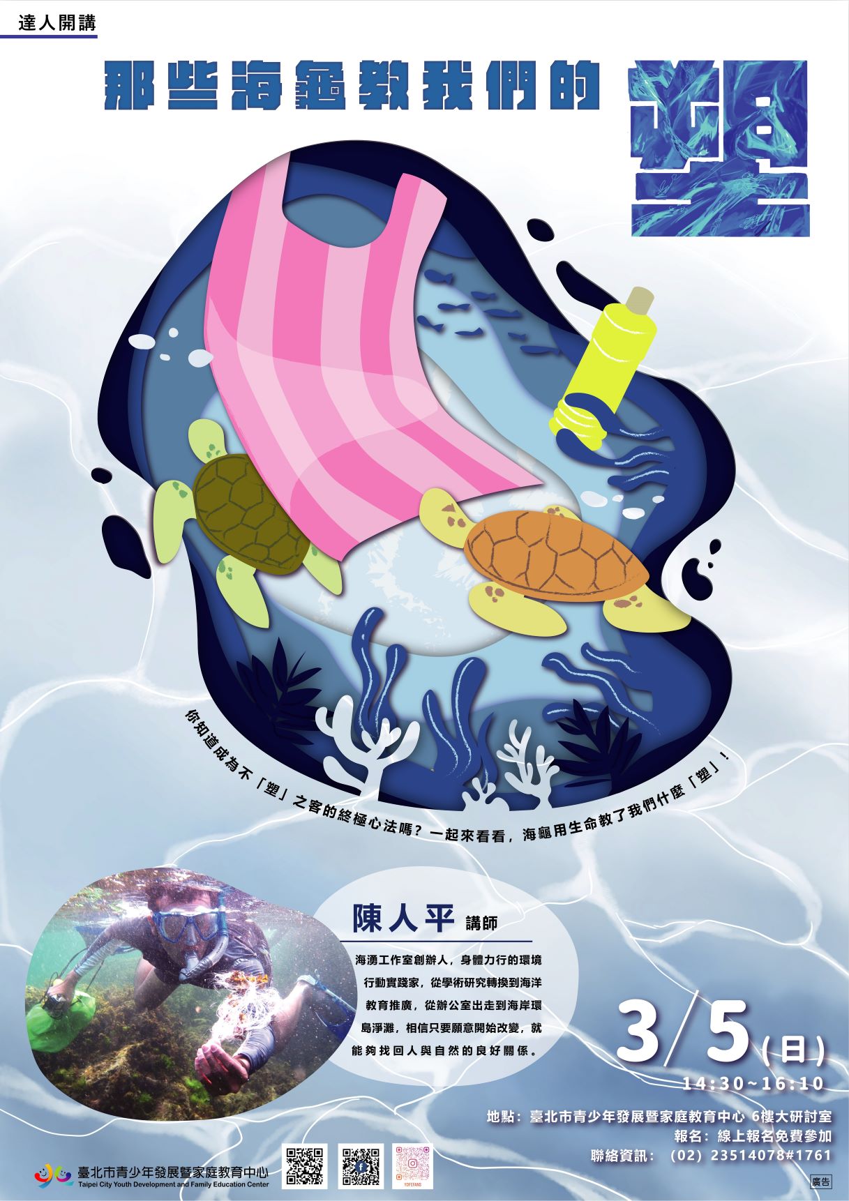 一、經由講師職涯經驗分享,讓年輕學子認識各行各業,藉以 了解自身興趣及性向,進而找到未來的道路與建立自我價 值;海湧工作室創辦人陳人平老師以個人經驗出發,與青 年學子分享他踏上致力於海洋廢棄物議題、海洋保育的心 路歷程與過程。