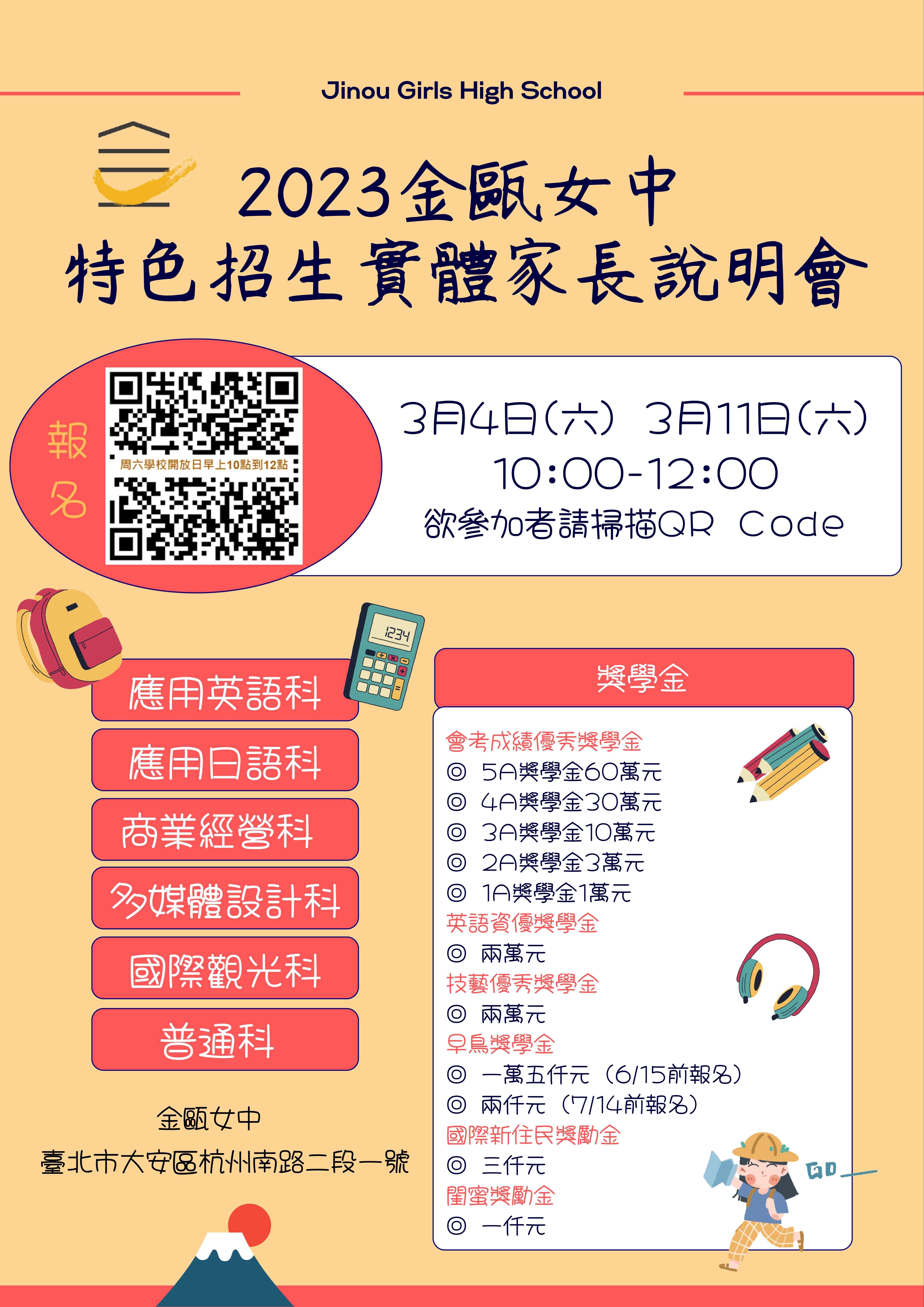 二、報名方式:即日起至112年3月10日(星期五)止,請逕至金 甌女中首頁(網址:https://www.cogsh.tp.edu.tw/home) 或直接至Googleq表單(網址:
