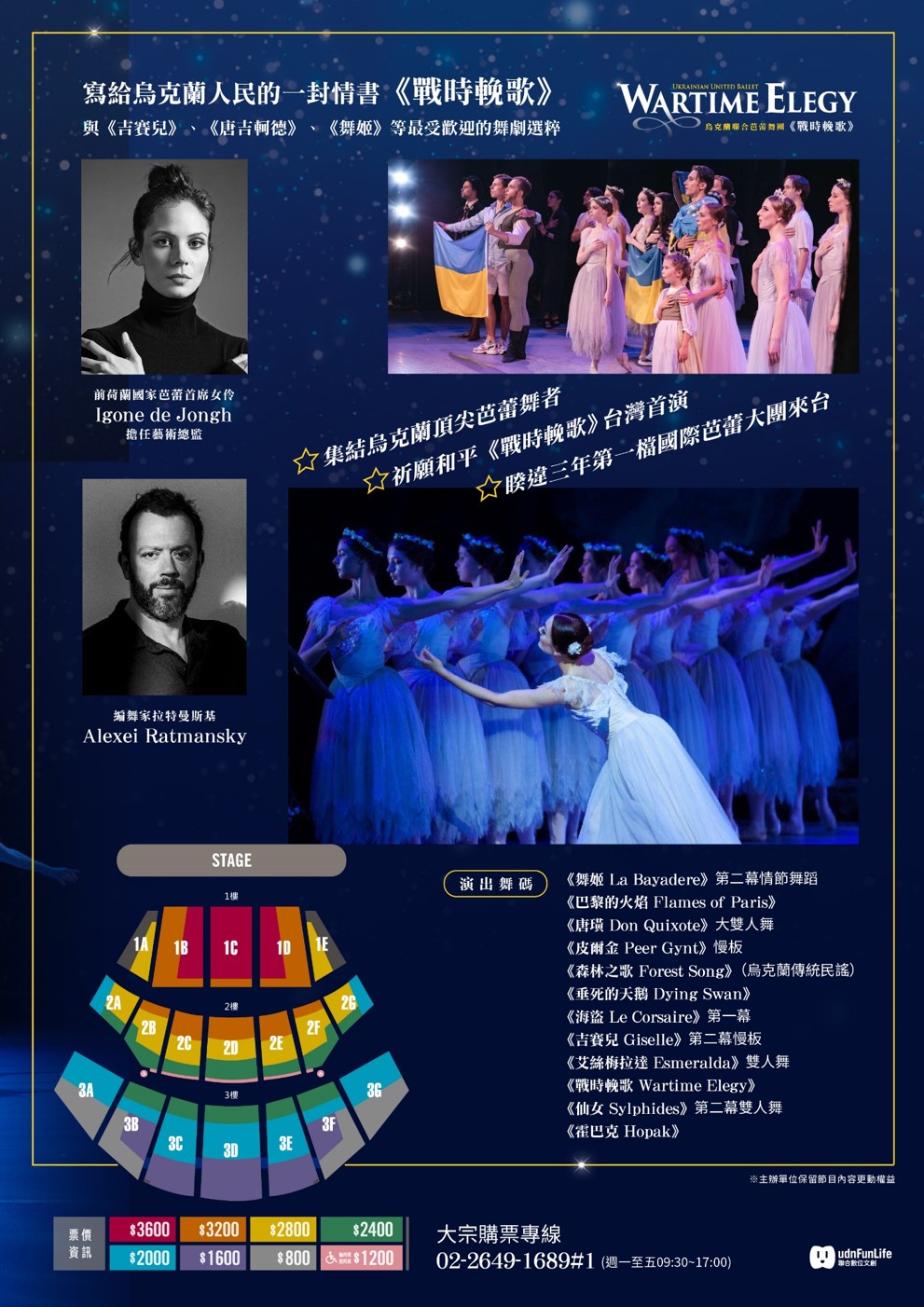(三)表演介紹:烏克蘭聯合芭蕾舞團(United Ukrainian Ballet)集結一群烏克蘭頂尖芭蕾舞者,他們來自於烏 克蘭各地劇院與舞團,因烏俄戰爭而流離失所,最後落 腳荷蘭海牙,在此重拾舞鞋,恢復日常的訓練,組成一 支職業舞團,在此作為烏克蘭芭蕾舞者的戰時庇護所。 2022年烏克蘭聯合芭蕾舞團陸續巡演英國、澳洲、新加 坡、美國等地,所到之處票券銷售一空,感動無數觀 眾,讓世人見證藝術撫慰人心的神奇力量。本次舞團將 帶來《戰時輓歌》、《吉賽兒》、《唐吉軻德》、《舞 姬》等最受歡迎的舞劇選粹。《戰時輓歌Wartime Elegy》是當代最重要的編舞家之一拉特曼斯基 (Alexei Ratmansky)在烏俄戰爭爆發後的全新創作, 但並未充滿政治訊息,相反地,他採用了烏克蘭當代最 知名作曲家西爾維斯特洛夫(Valentin Silvestrov)的 音樂,加上烏克蘭傳統歌曲,是拉特曼斯基寫給烏克蘭 人民的一封情書,向他們堅韌不拔的精神致敬,並祈禱 未來的和平。其他精采節目包括《舞姬La Bayadere》充 滿動感與異國風情的第二幕;以雙手關節展現不可思議 靈活度與生命力的《垂死的天鵝The Dying Swan》;挑 戰男女舞者技巧極限的《海盜 Le Corsaire》第一幕; 以及《唐吉軻德Don Quixote》的大雙人舞等,其32鞭轉 的難度完全不遜於黑天鵝在《天鵝湖》的高潮。此外, 舞團更特邀世界其他頂尖舞團的烏克蘭舞星,包括前馬林斯基首席Anastasia Matvienko與Denis Matvienko, 以及英國國家芭蕾的Katya Khaniukova等人加入客席陣容,為台灣民眾帶來一場最精采的芭蕾盛宴,希望以藝 術感動人心,為這個紛擾的世界帶來光明與希望。