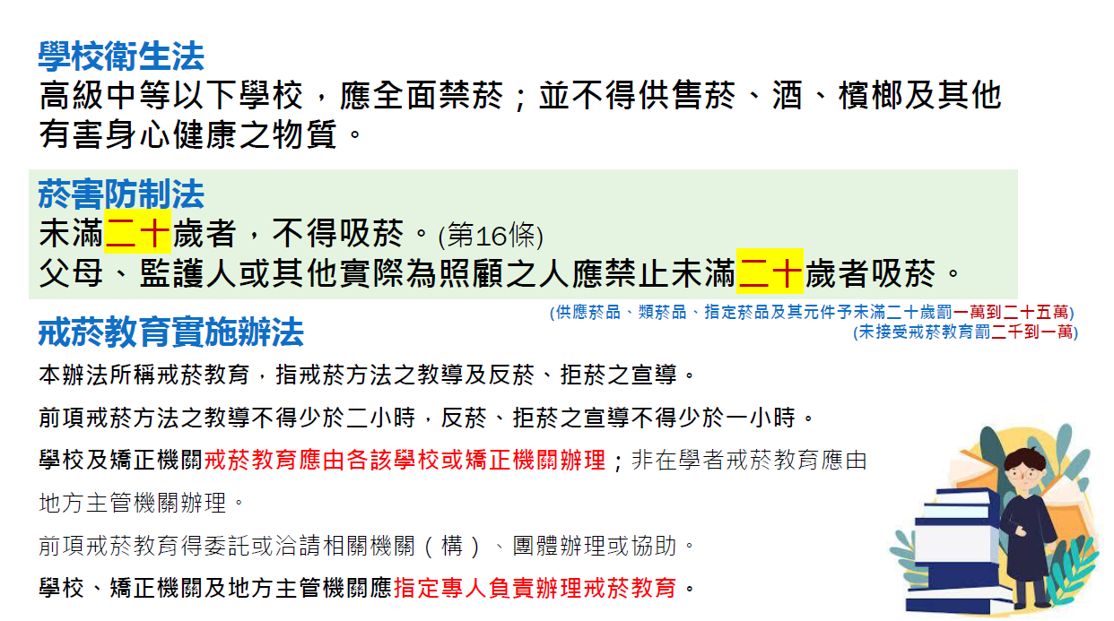 二、 本市高級中等以下學校學生,學生禁菸年齡配合菸害防制法提高至 20 歲)