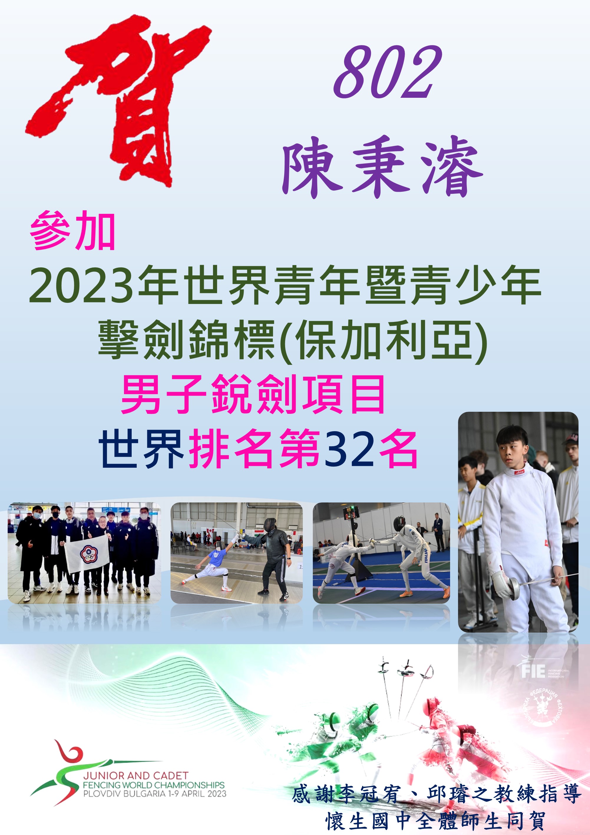 賀!802陳秉濬參加2023年世界青年暨青少年擊劍錦標(保加利亞)男子銳劍項目世界排名第32名。