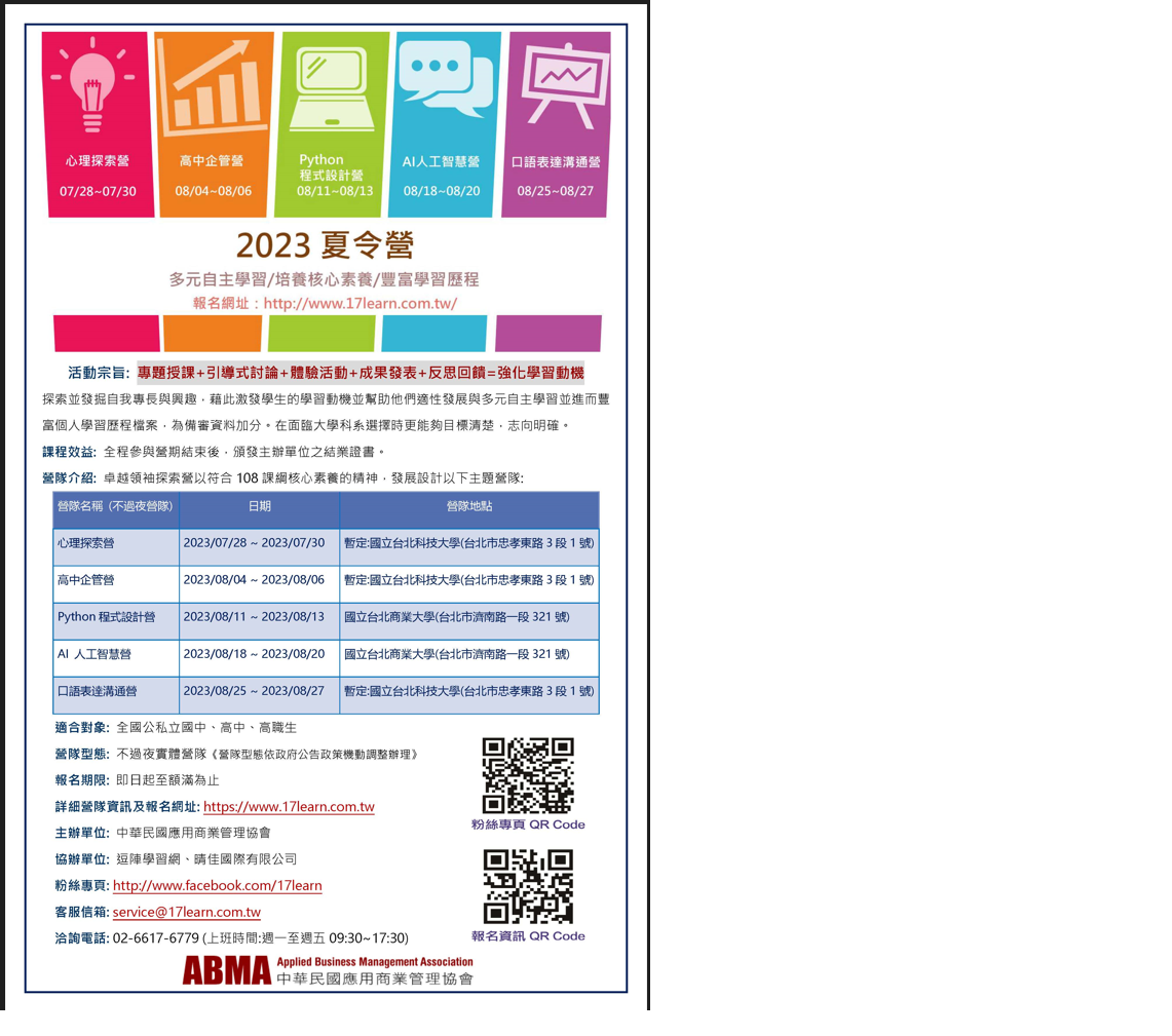 二、營隊名稱:「心理探索營」、「高中企管營」、「AI人工智 慧營」、「口語表達溝通營」、「Python程式設計營」