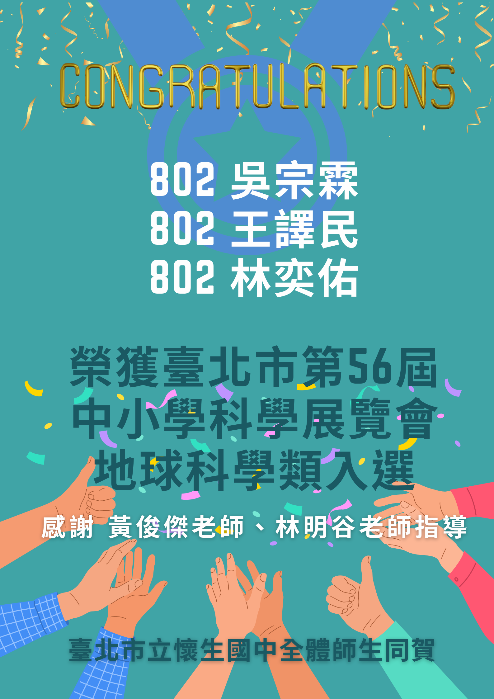 802吳宗霖、王譯民、林奕佑同學榮獲國中組地球科學科入選