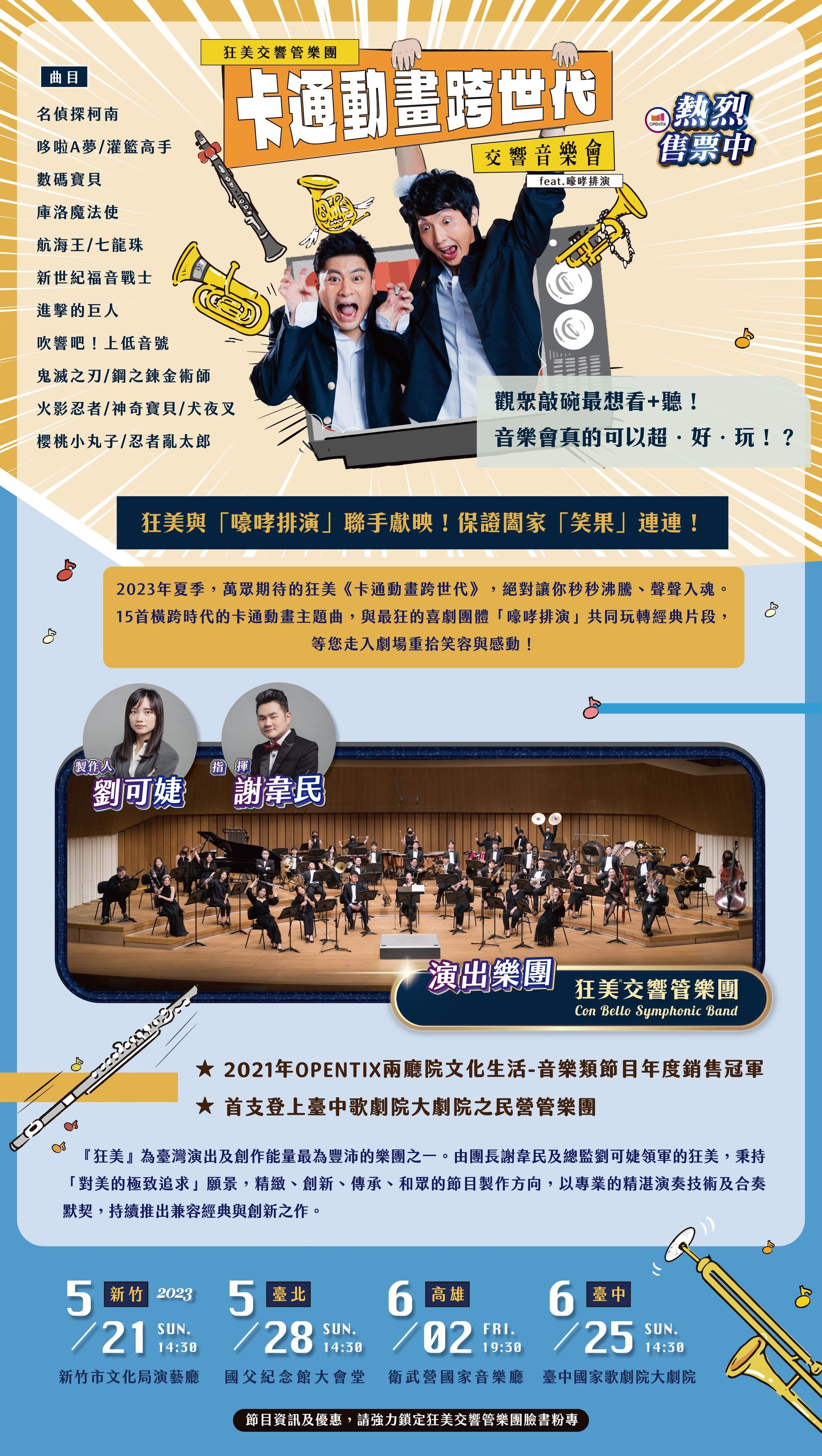 一、節目介紹:2023年盛夏,萬眾期待的狂美《卡通動畫跨世 代》精選多部話題度最高的動畫作品,從80年代起的七龍珠、灌籃高手、名偵探柯南、神奇寶貝,到近代的航海王、火影忍者、鬼滅之刃…等,並邀請最具創意的「嚎哮排演」以多面向的戲劇表演、喜劇段子,復刻經典畫面和劇情橋段,加上狂美詮釋的主題曲,讓您一次滿足所有想像可能!絕對讓你秒秒沸騰、聲聲入魂。