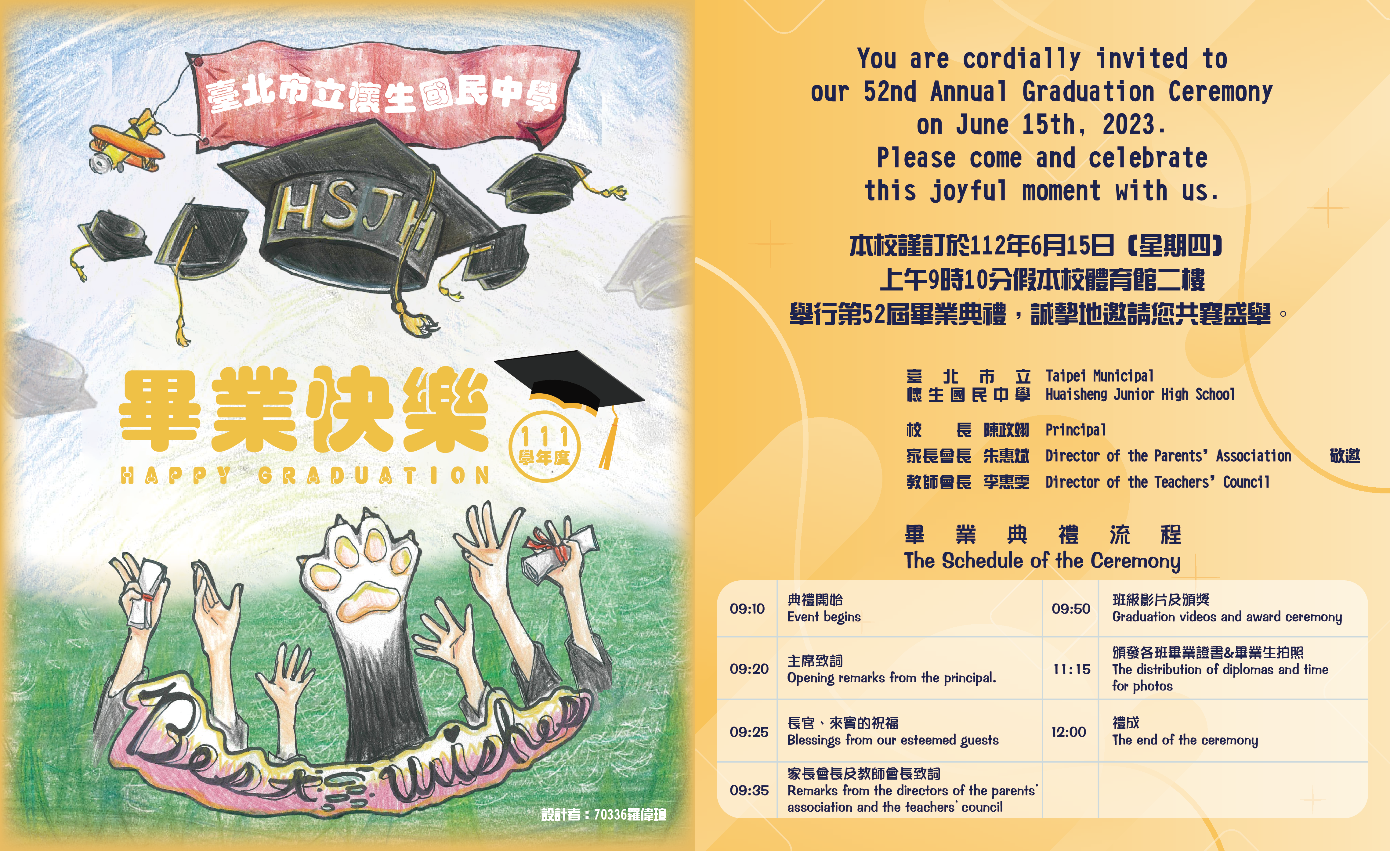 本校謹訂於112年6月15日(四)上午9:10分假本校體育館二樓舉行第52屆畢業典禮,誠摯邀請您共襄盛舉。