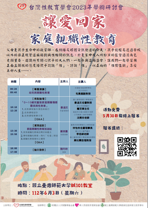 台灣性教育學會辦理2023年「讓愛回家~家庭親職性 教育」學術研討會,請學校教師踴躍報名參加。