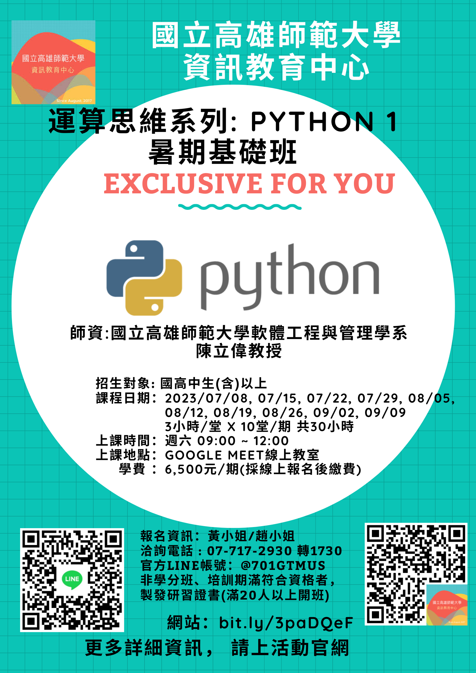 (一)運算思維系列:Python 程式語言基礎班【國高中線上班】。上課日期 2023/07/08~2023/09/09每週六早上 9: 00~12:00 開課,共10堂。