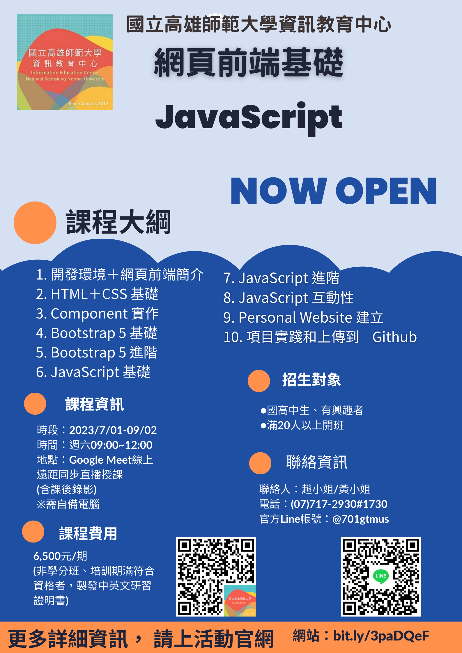 (二)JavaScript 網頁前端基礎課程【國高中線上班】。上課 日期 2023/07/01~2023/09/02每週六早上 9:00~12:00 開課,共10堂。