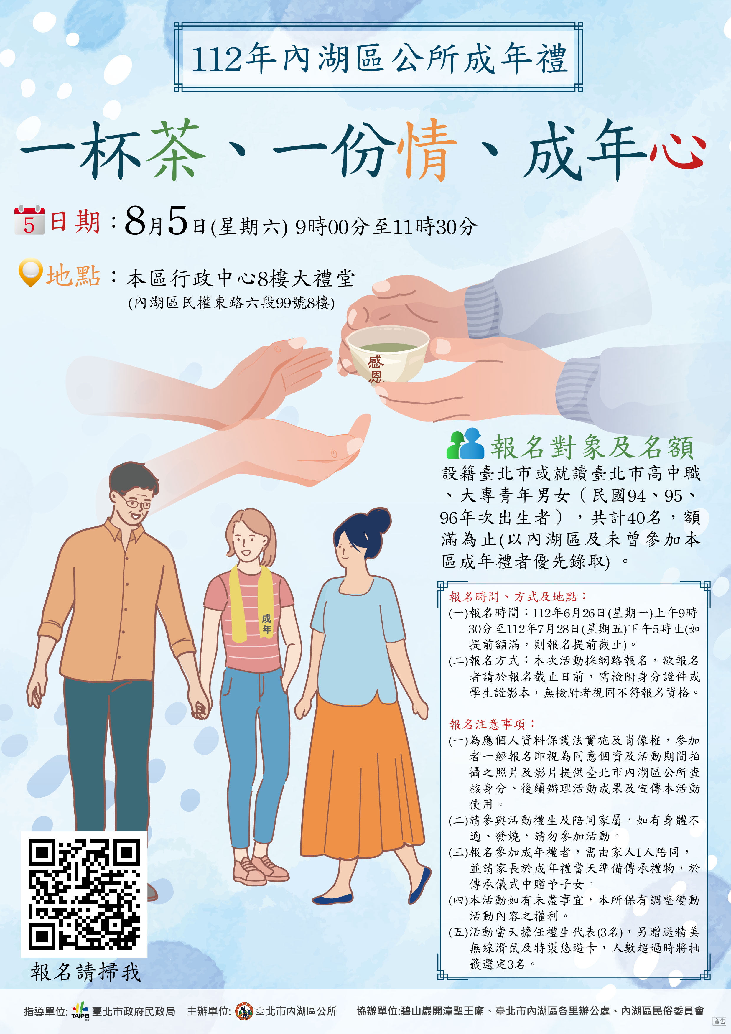 一、臺北市內湖區公所112年度成年禮活動,訂於8月5日(星期六)上午9時舉辦,凡成功報名並全程參與之禮生,可獲得成年禮紀念郵票、智慧 巾、茶具組及禮券600元各1份。活動內容包含茶道文化體 驗、穿越智慧門、行感恩禮及成年禮專屬拍貼機,即日起 開放報名,歡迎設籍或就讀於臺北市之青年男女(民國94 至96年次)踴躍報名參加,內容豐富,精彩可期。」