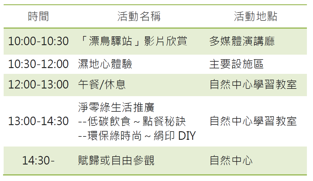 活動內容: 濕地主題活動 x 生活布製品再利用 x 綠生活促進透過活動,讓長者們對於濕地環境保育及淨零綠生活有更多認知,一起從生活中關愛環境。實地參訪濕地保育教育場域,並從活動的交通、飲食等面向具體實踐淨零綠生活。