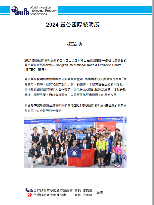 一、「曼谷國際發明展」是經濟部智慧財產局公告著名國際發 明展之一,全球參賽作品超過1000件,堪稱為亞洲大型的 發明展,更是優良創新商品行銷的國際平台。