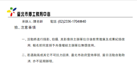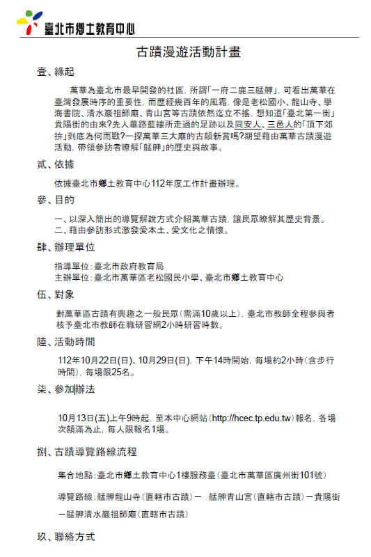 (三)活動對象:對萬華區古蹟有興趣之一般民眾(需滿10歲 以上),臺北市教師全程參與者核予臺北市教師在職研 習網2小時研習時數。