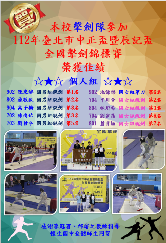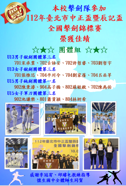 本校擊劍隊參加112年度全國中等學校擊劍錦標賽表現優異,成績斐然: