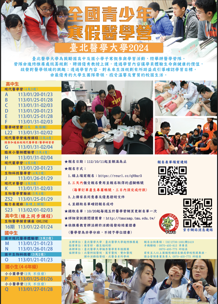 二、營隊資訊:2024寒假醫學營擬訂於民國113年1月20日至2月 4日辦理。網址 http://tmucamp.tmu.edu.tw/