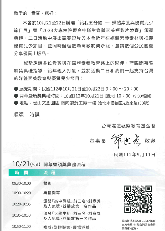 二、活動詳情請洽詢「財團法人台灣媒體觀察教育基金會」潘 先生,聯繫電話:02-23582672,會址:臺北市中正區南昌 路1段114號6樓。