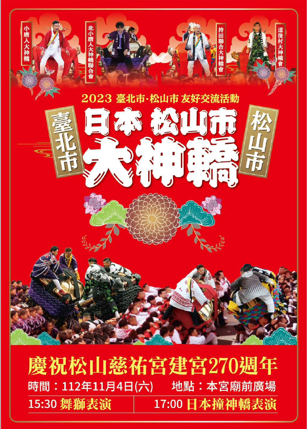 「2023日本愛媛縣松山市大神轎撞轎祈福活動 (松山場)」將於11月4日(星期六)下午5時於松山慈 祐宮廟前廣場登場!繼2019年後,睽違4年財團法人台北 市松山慈祐宮再度邀請日本松山市道後八町「小唐人大 神轎」、「北小唐人大神轎連合會」、「持田聯合大神 轎會」及「道後村大神轎會」等4支隊伍,帶來4頂大神 轎至松山區演出,讓民眾不需出國便能在松山慈祐宮廟 前廣場欣賞到日本原汁原味熱血沸騰的撞轎祭典!另 外,當日下午3時30分起於松山慈祐宮廟前廣場即有舞獅 表演暖場,誠摯歡迎市民朋友一同共襄盛舉。