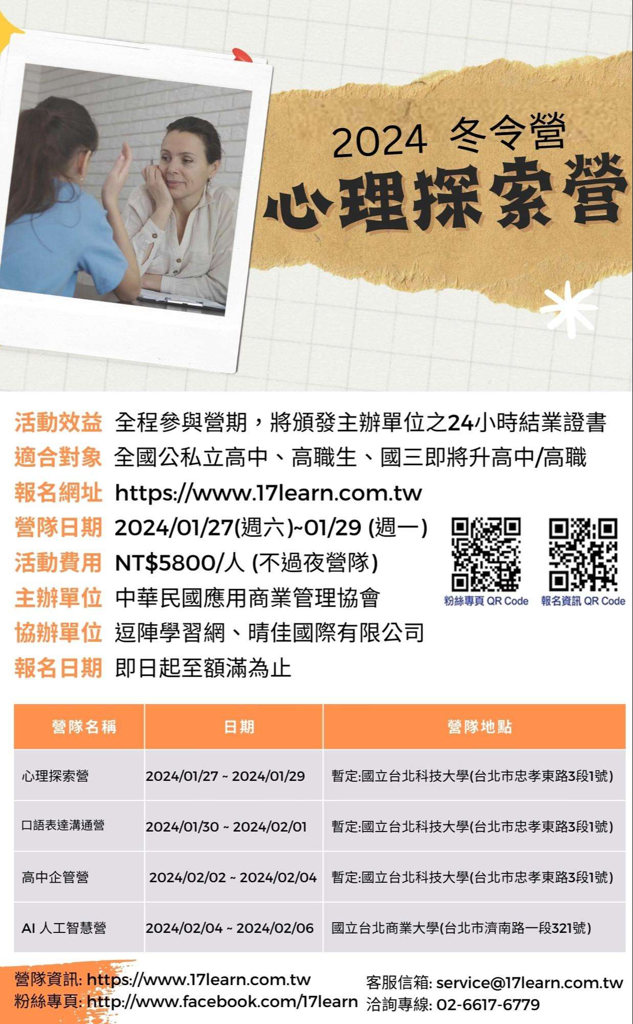 八、另有多項冬令營隊:高中企管營、AI人工智慧營、口語表達溝通營,歡迎報名參加。
