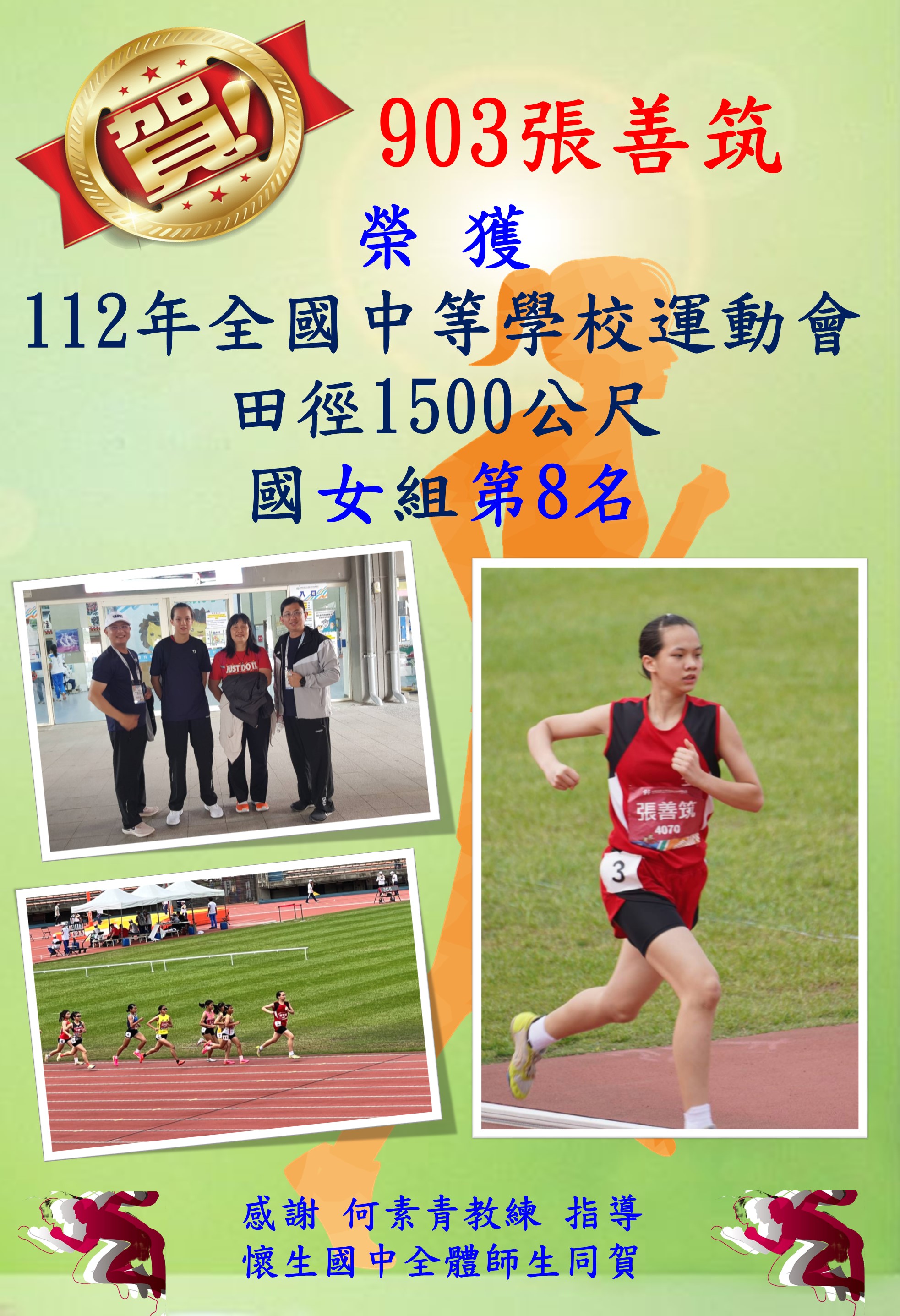 賀!本校張善筑同學參加 112年全國中等學校運動會田徑1500公尺國女組第8名!