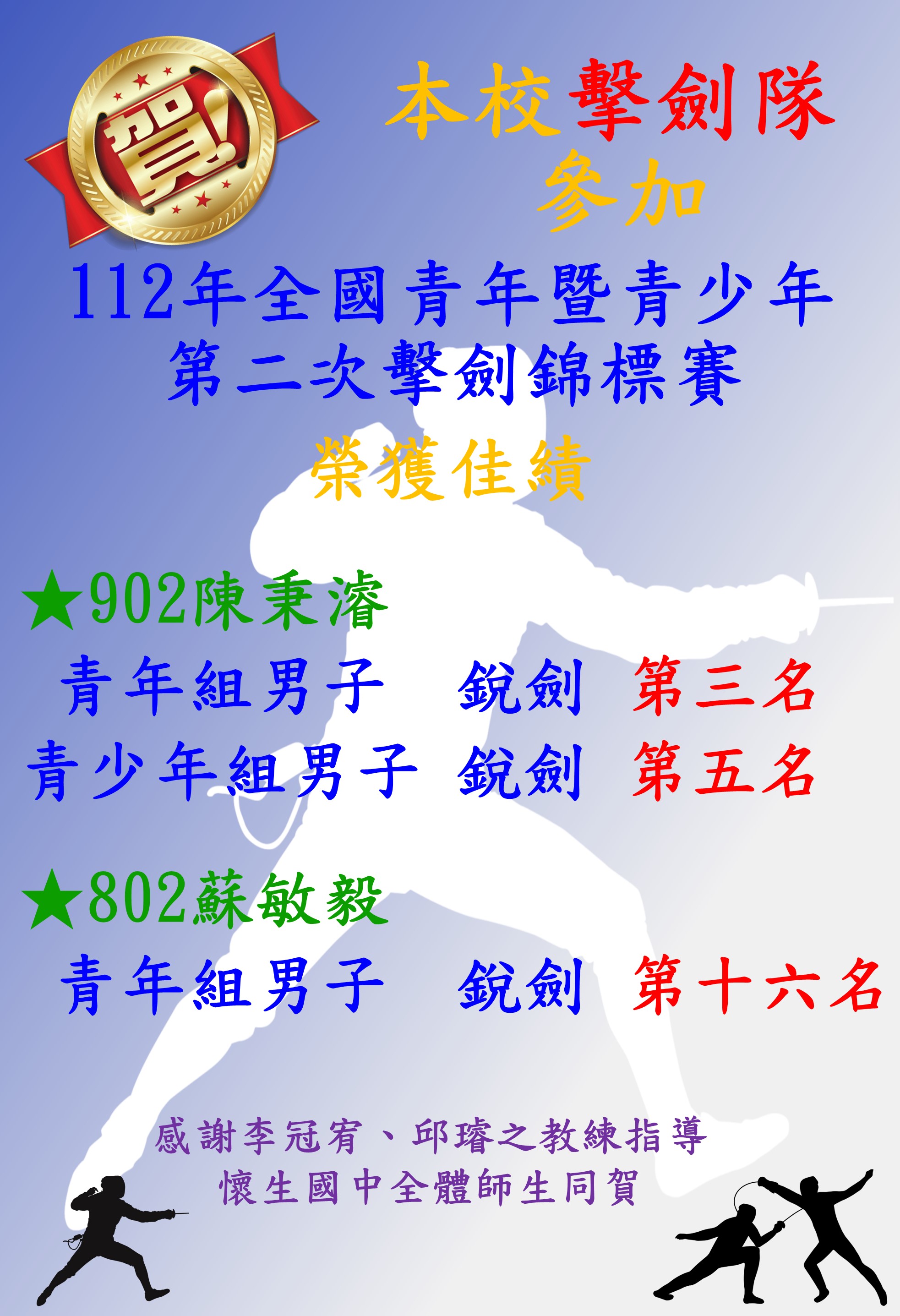 賀!本校擊劍隊參加「112年全國青年暨青少年第二次擊劍錦標賽」榮獲佳績!