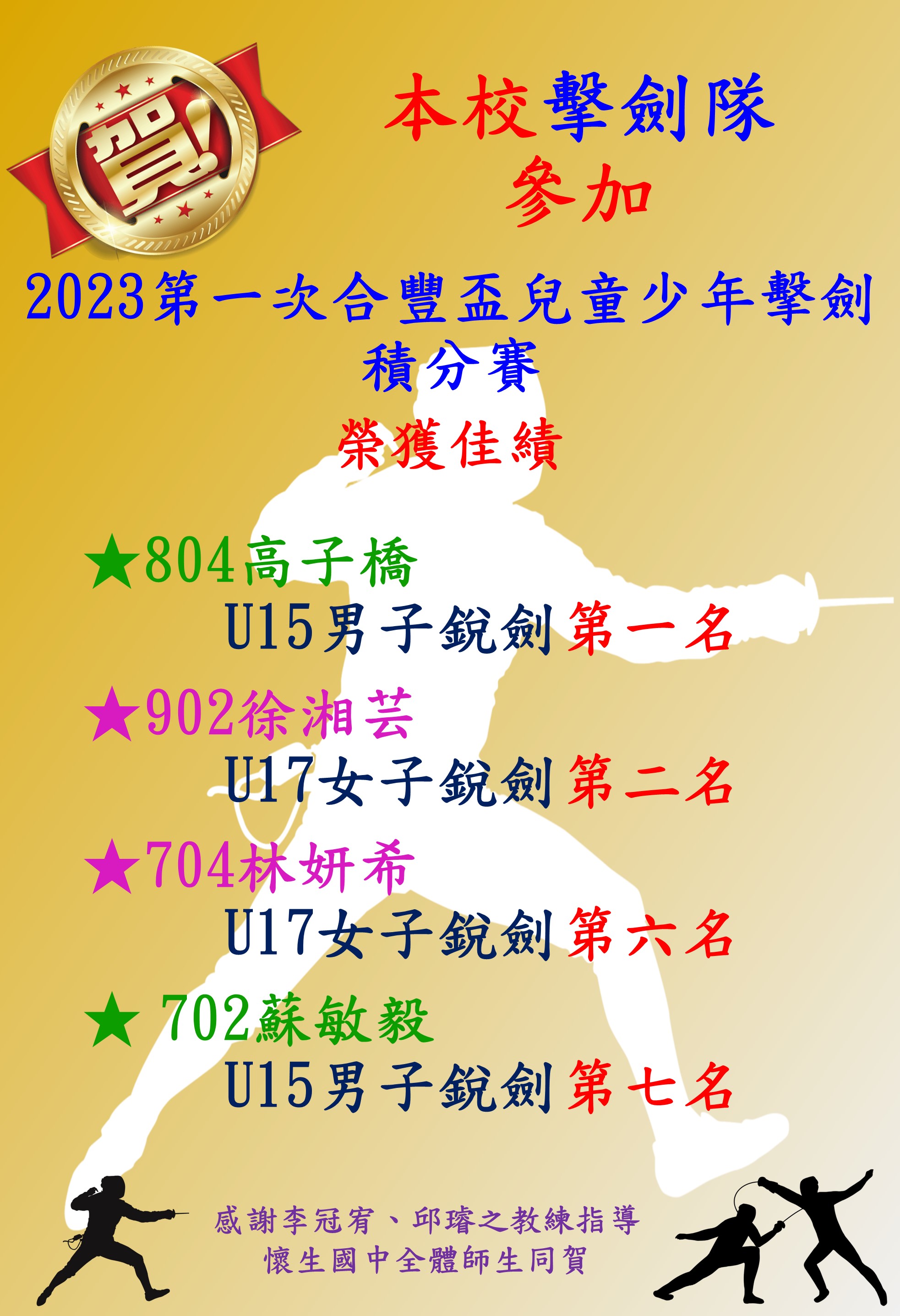 !本校擊劍隊參加 「2023第一次合豐盃兒童少年擊劍積分賽」榮獲佳績!