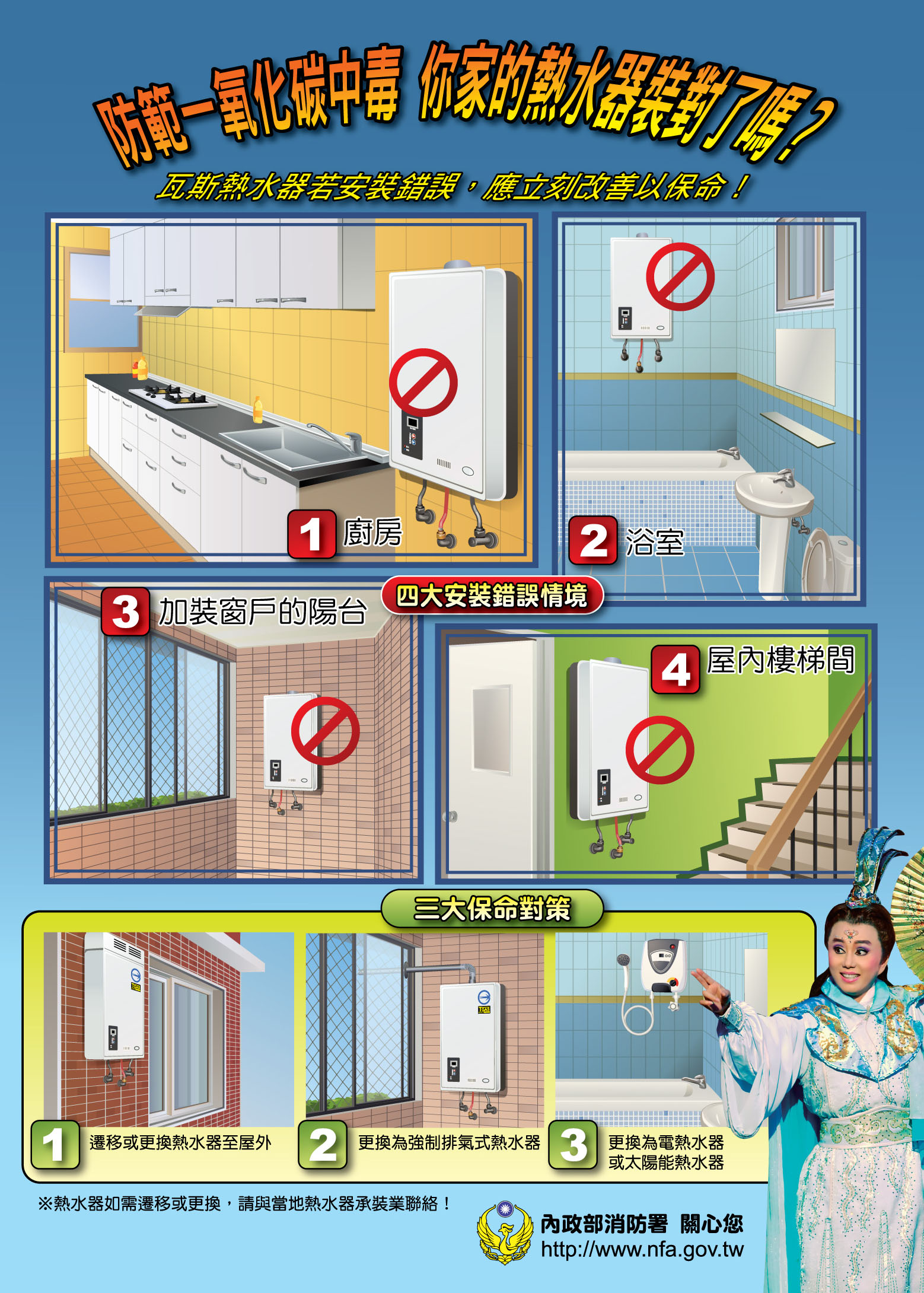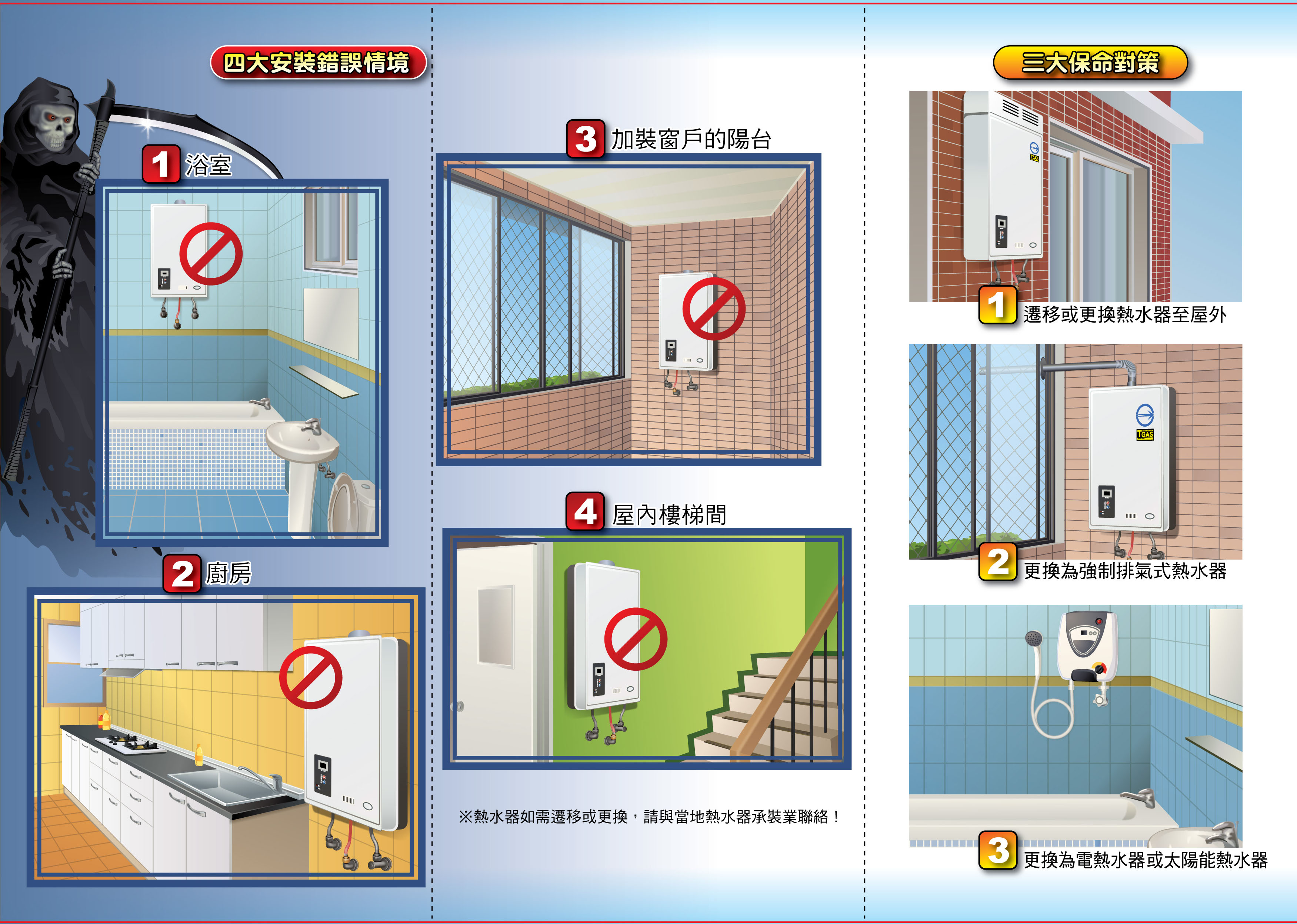 使用燃氣熱水器時,若有頭昏、噁心、嗜睡等身體不適情況發生,請立即停止使用熱水器,打開通往室外的窗戶通風,身體嚴重不適時,請先前往通風良好的室外環境,再打119電話求助。