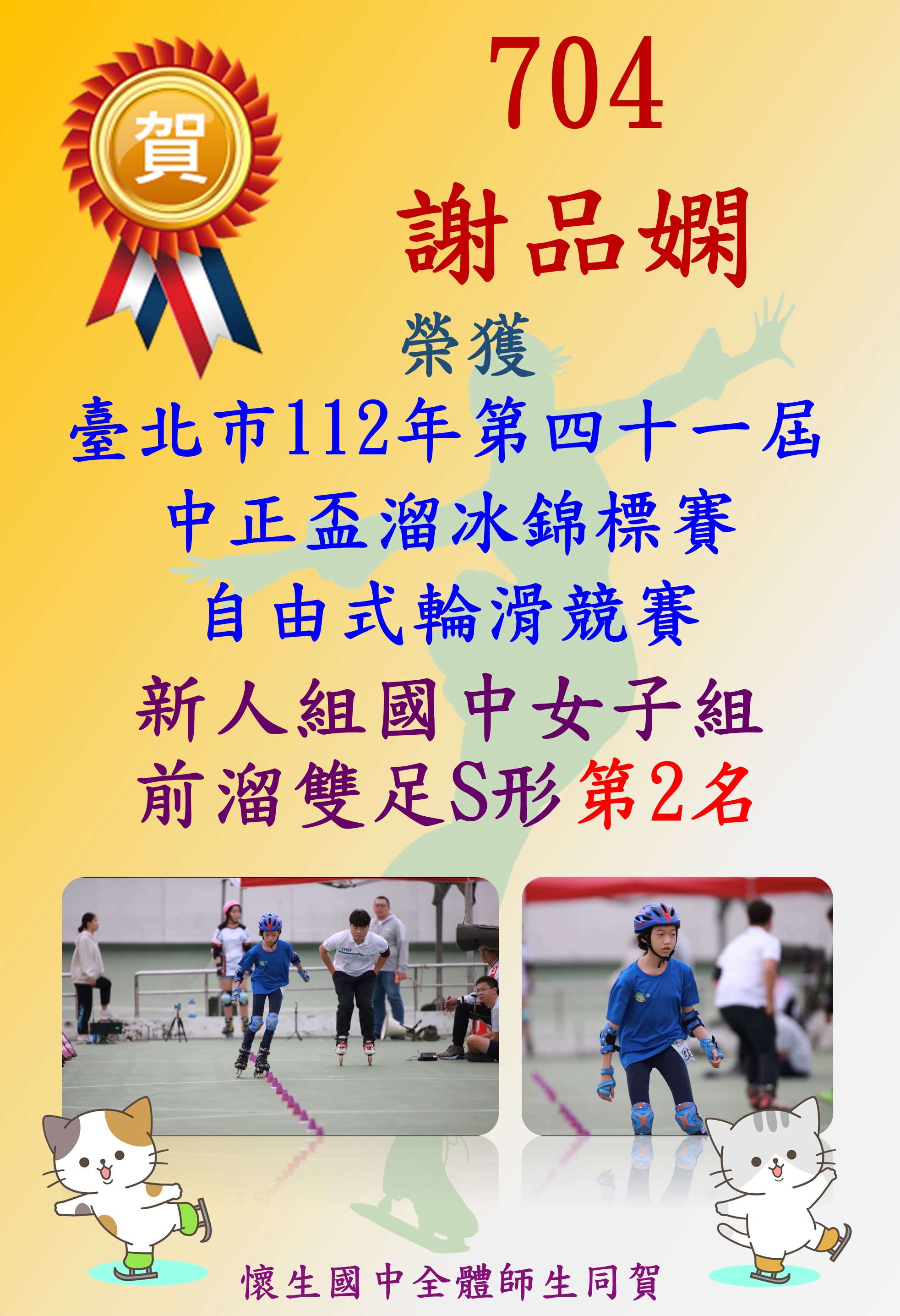 榮獲 新人組國中女子組前溜雙足S形第2名!