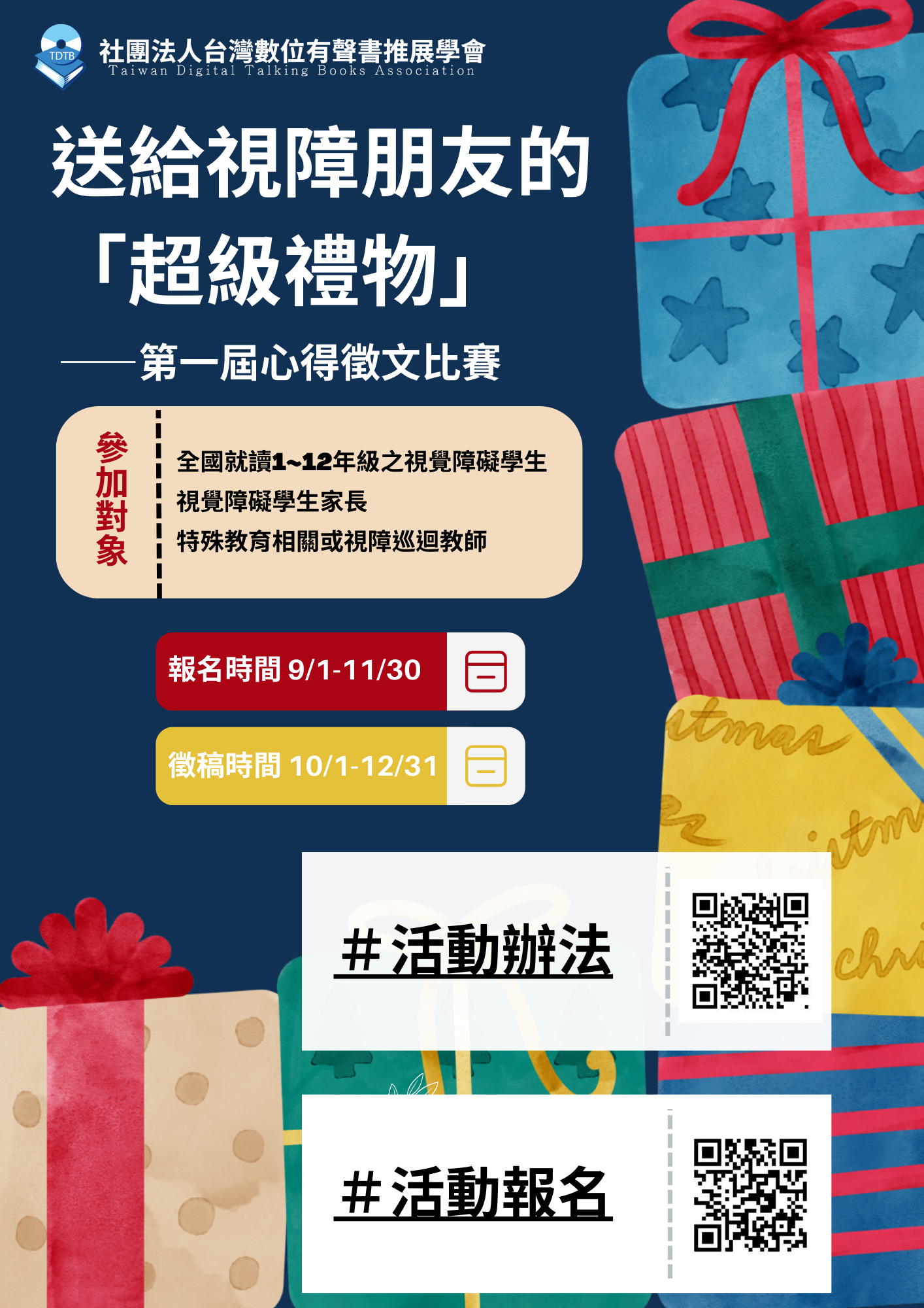 二、台灣數位有聲書推展學會為鼓勵全國視障中小學生應用自主閱讀資訊之能力,舉辦旨揭心得徵文活動,期藉邀學生等相關族群結合徵文主題與生活經驗,投稿分享自身經驗與故事。