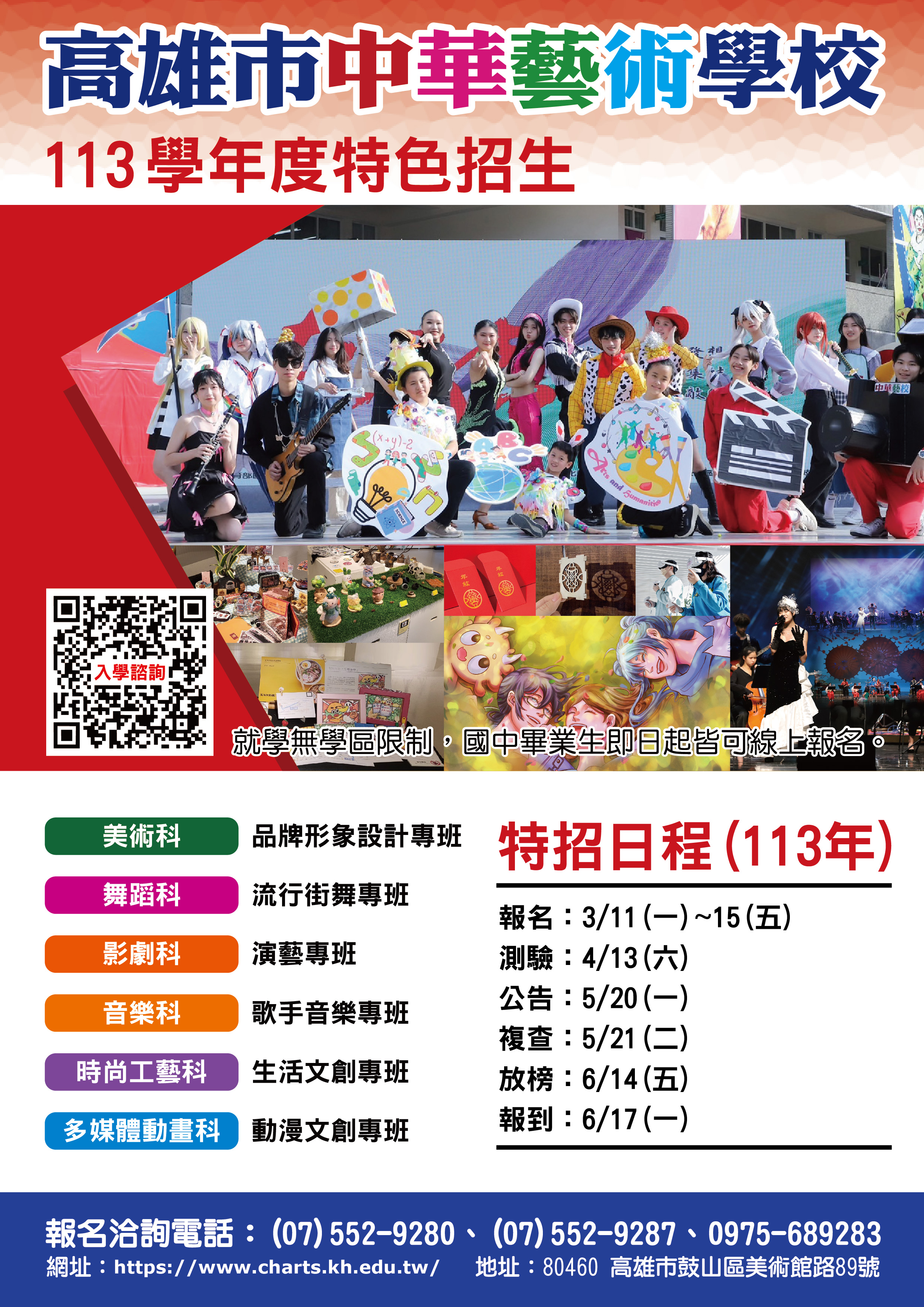 二、本校113學年度特色招生將於113年3月11日至3月15日受理 報名,招生科班計有美術科、多媒體動畫科、時尚工藝 科、影劇科、音樂科及舞蹈科,相關資訊詳見招生DM(如附件)。