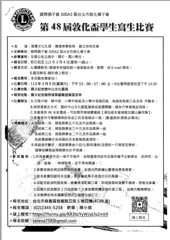 臺北市敦化國際獅子會訂於113年3月9日(星期六),下午13:00~17:00止假國立國父紀念館舉行「第48屆敦化盃高中、國中、國小學生寫生比賽」,請踴躍報名參加。