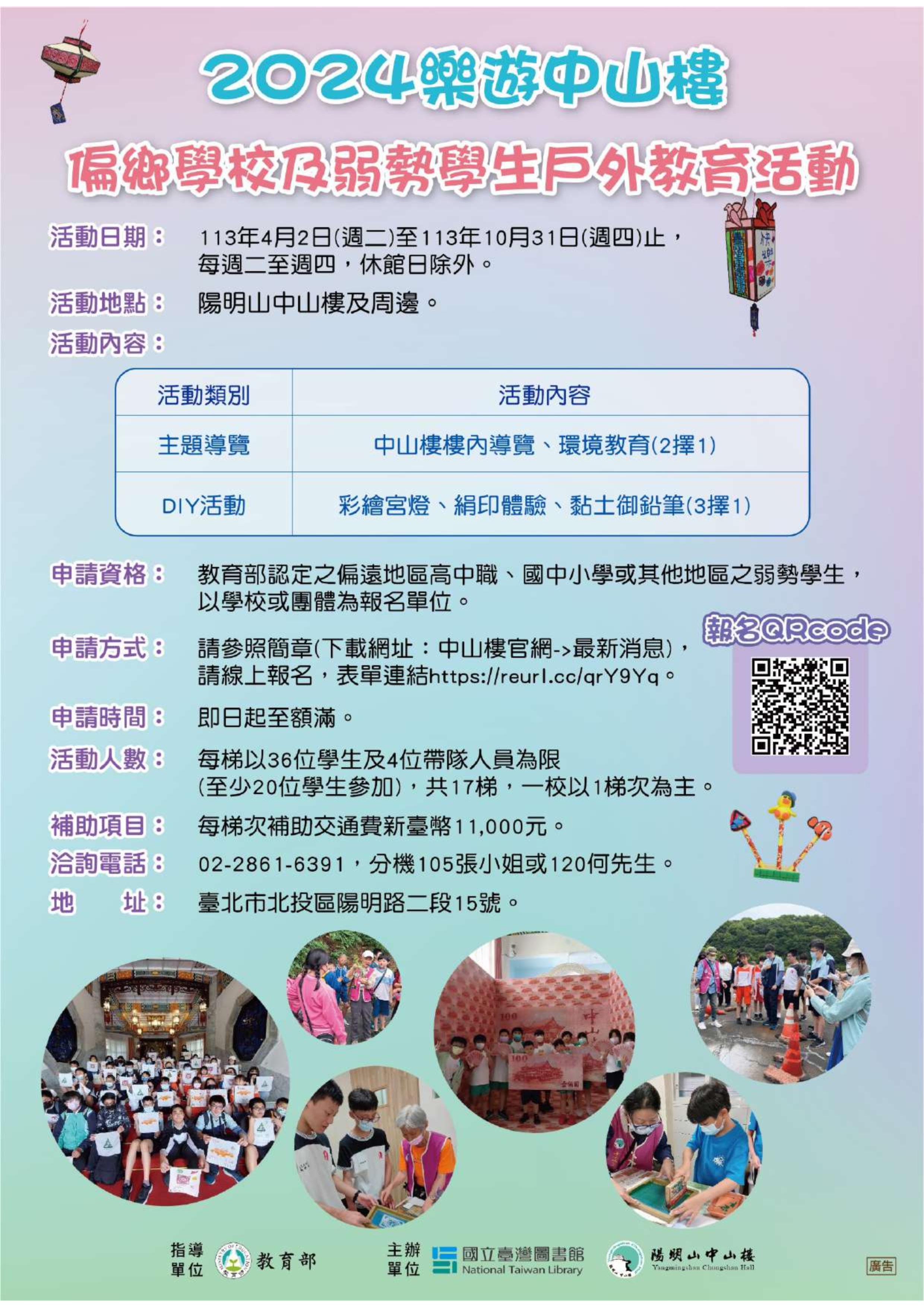 一、旨揭活動預計辦理17梯次,每梯次以36位學生及4位帶隊人員為限,活動內容為主題導覽、DIY及環境教育活動,活動期間為本(113)年4月2日至10月31日止。